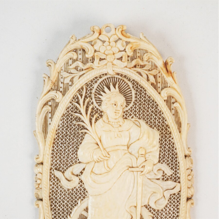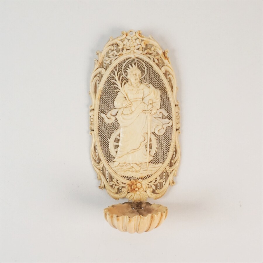 Bénitier "Sainte Catherine avec ses attributs", ivoire sculpté avec son bassin figurant une coquille, travail dieppois de la fin du 18e siècle, H. 15 cm (restaurations à la base de la vasque).