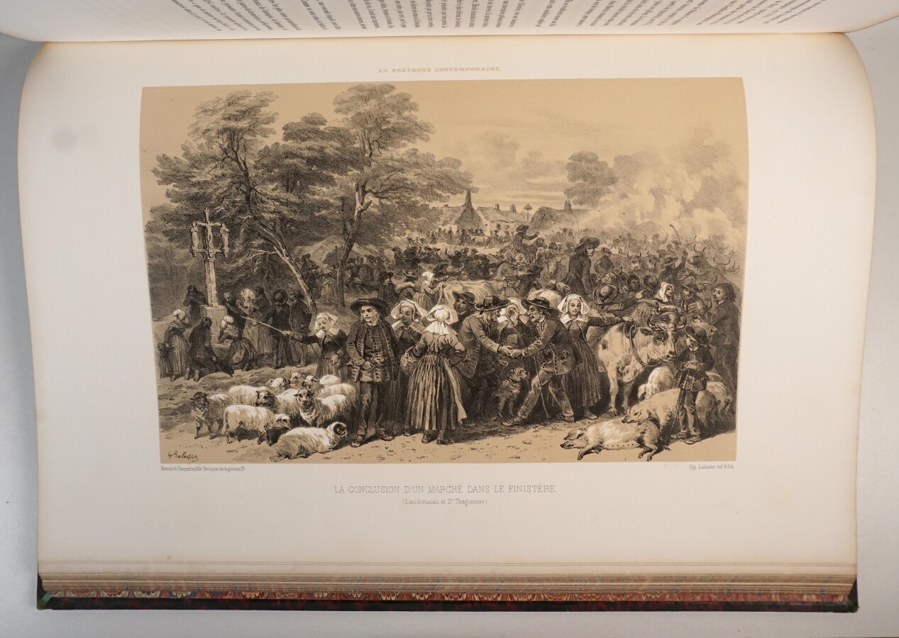 BENOIST (Félix) - COURSON (Aurélien de) - POL DE COURCY - [] - La Bretagne contemporaine. Sites pittoresques, monuments, costumes, scènes de moeurs, histoires, légendes, traditions et usages des cinq départements de cette province - Paris, Nantes ; Charpentier, 1867 - 5 parties en 5 volumes grand In-folio - De rares rousseurs éparses - 5 sous titres : Loire-Inférieure, Morbihan, Finistère, Côtes-du-Nord et Ille-et-Vilaine - Complet de sa carte de Bretagne et couleurs et de ses 164 planches hors texte d'après les dessins de Félix Benoist lithographiées par les premiers artistes de Paris : MM. Jul. Arnout, Bachelier, Bayot, Félix Benoist, Eug. Ciceri, - Reliure de l'époque demi-chagrin rouge (1 coin cassé au 1er plat du tome III) - Dos à nerfs titrés et tomés or - Tranches marbrées - Bon exemplaire.