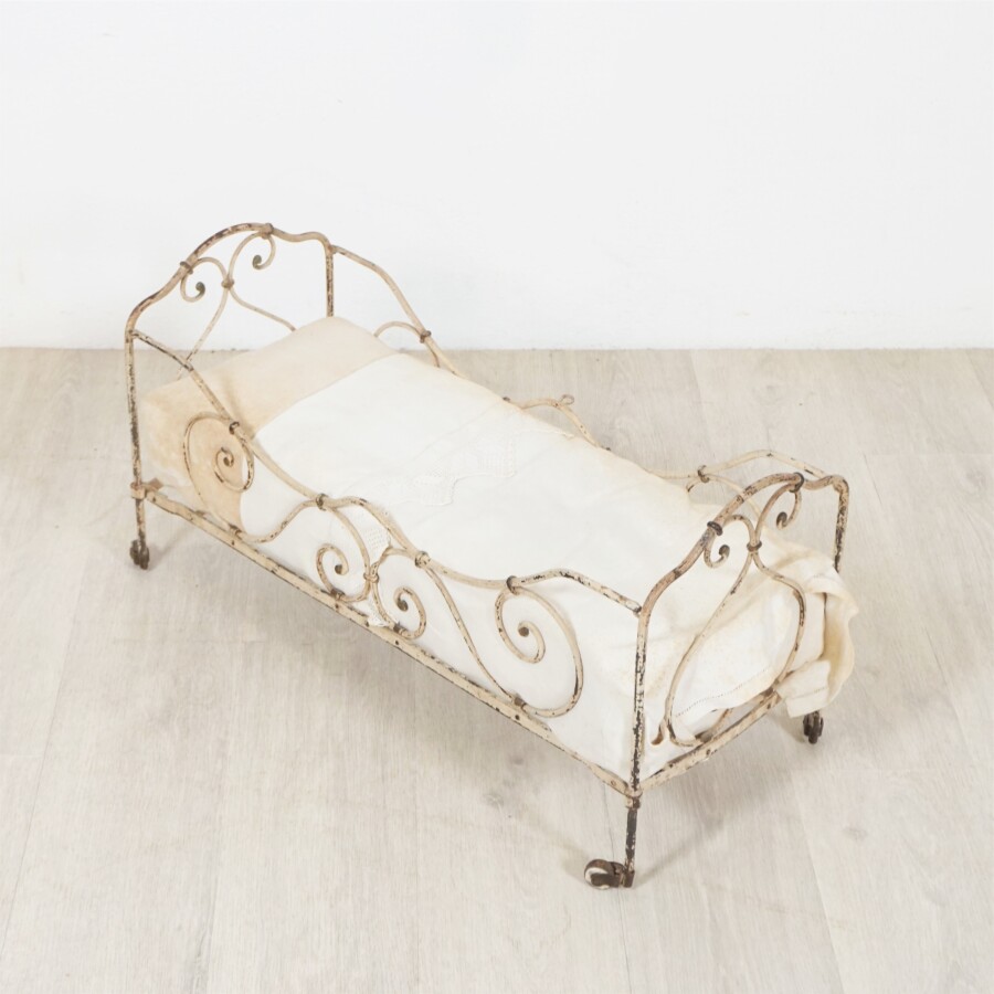 On joint un lit de poupée en métal laqué blanc, sur roulettes, L. 65 cm (en l'état).