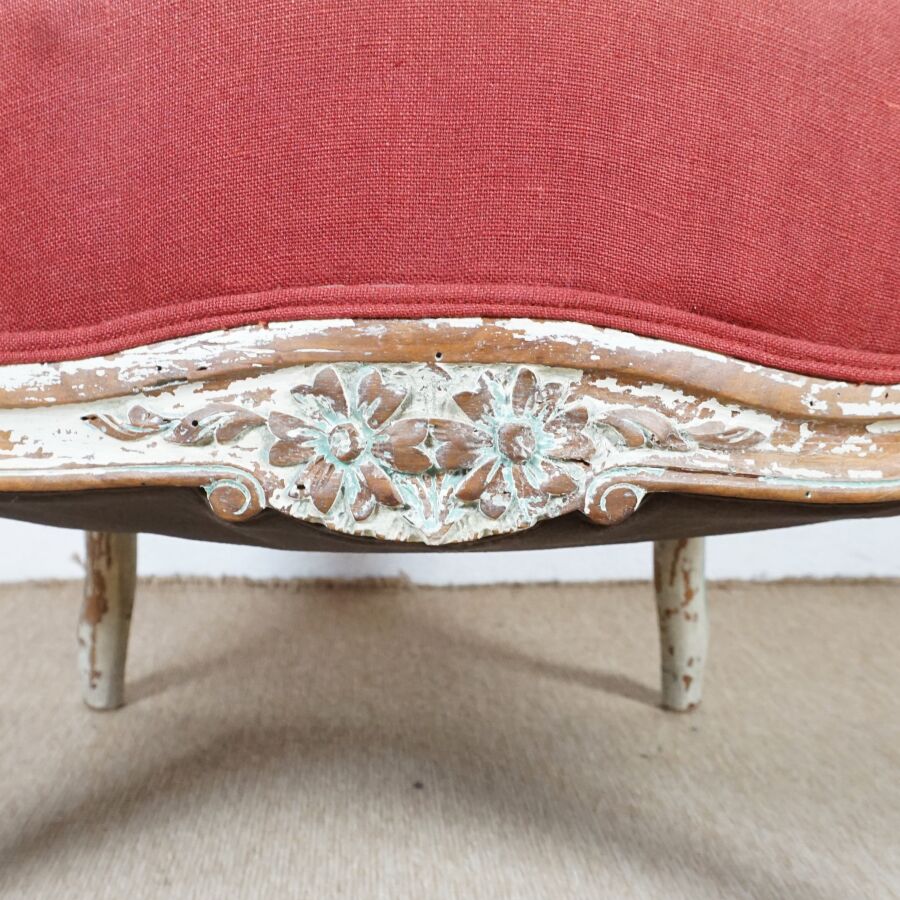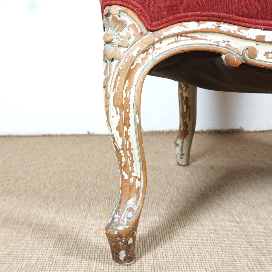Bergère en bois laqué blanc à décor sculpté de fleurettes, garniture moderne en tissu rouge orangé, de style Louis XV, H. 93 cm.