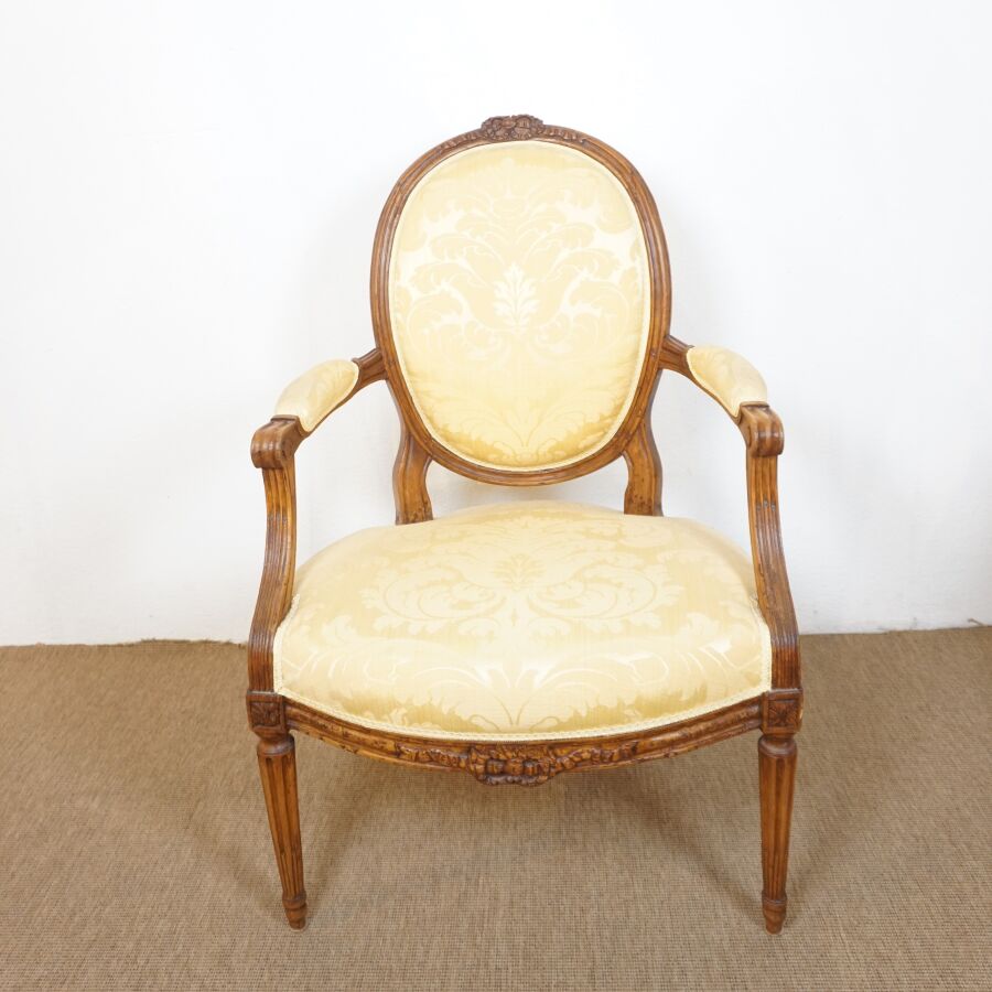 Bergère et fauteuil dit cabriolet, hêtre mouluré et sculpté à décor de noeuds, supports d'accotoirs nervurés, piètement cannelé et fuselé, d'époque Louis XVI, garniture jaune à décor floral rapportée, H. Fauteuil : 92 cm. H. Bergère : 100 cm (petites usures d'usage, bel état).