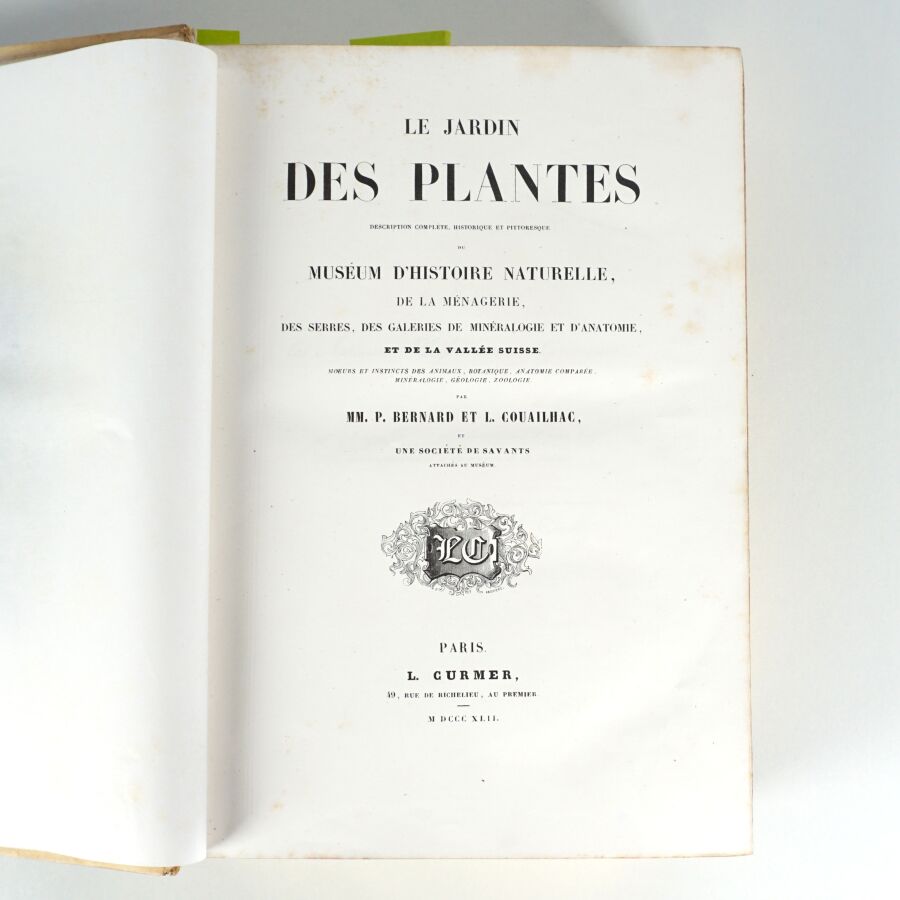 BERNARD (Pierre), COUAILHAC (L.) et LE MAOUT (Emmanuel). Le jardin des plantes, description complète historique et pittoresque du Muséum d'histoire naturelle. Paris, Curmer, 1842-1843. 2 vol. in-4, cartonnage illustré de l'éditeur, tranches dorées.