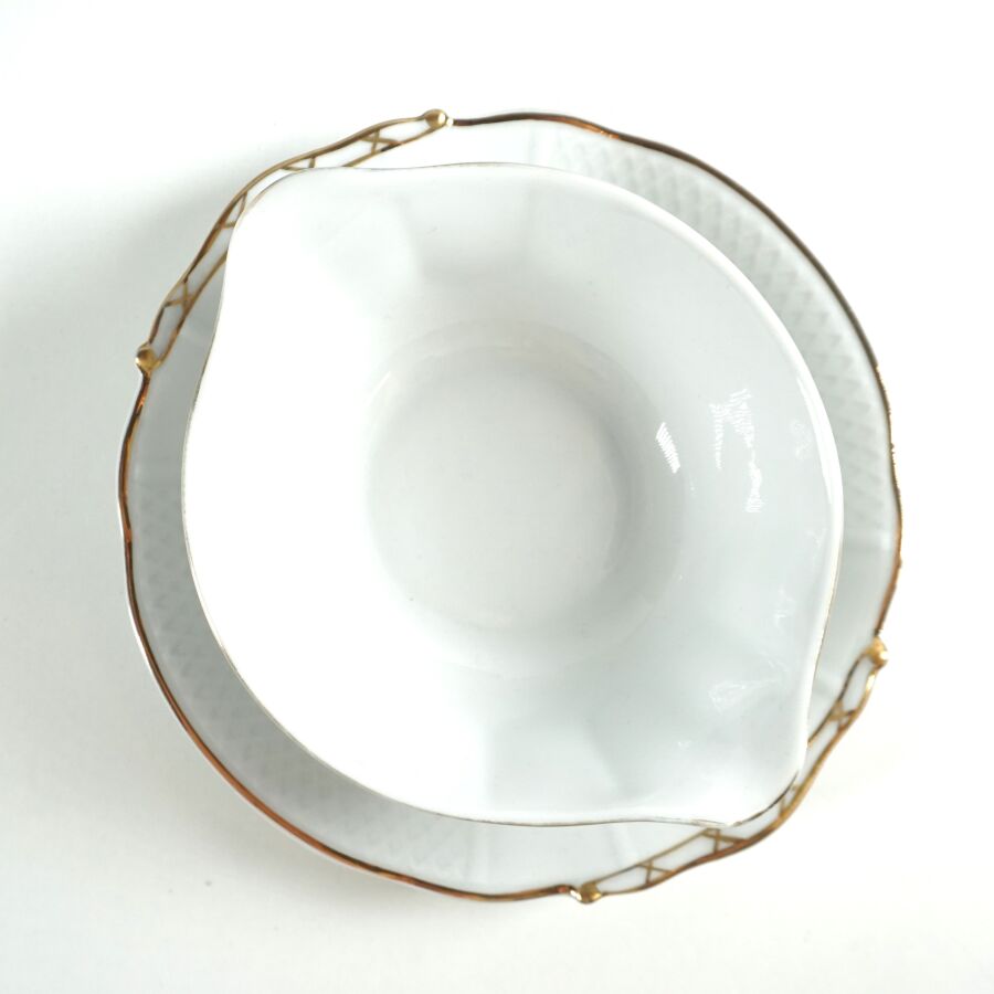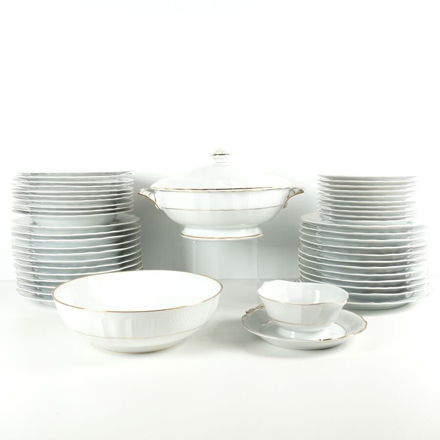 BERNARDAUD & CIE - LIMOGES : Partie de service de table, porcelaine émaillée blanche à décor d'un liseré or, comprenant 1 soupière, 1 saladier, 1 plat rond, 1 saucière, 10 assiettes creuses, 23 assiettes plates et 10 assiettes à dessert, marqué dessous (quelques usures et éclats).