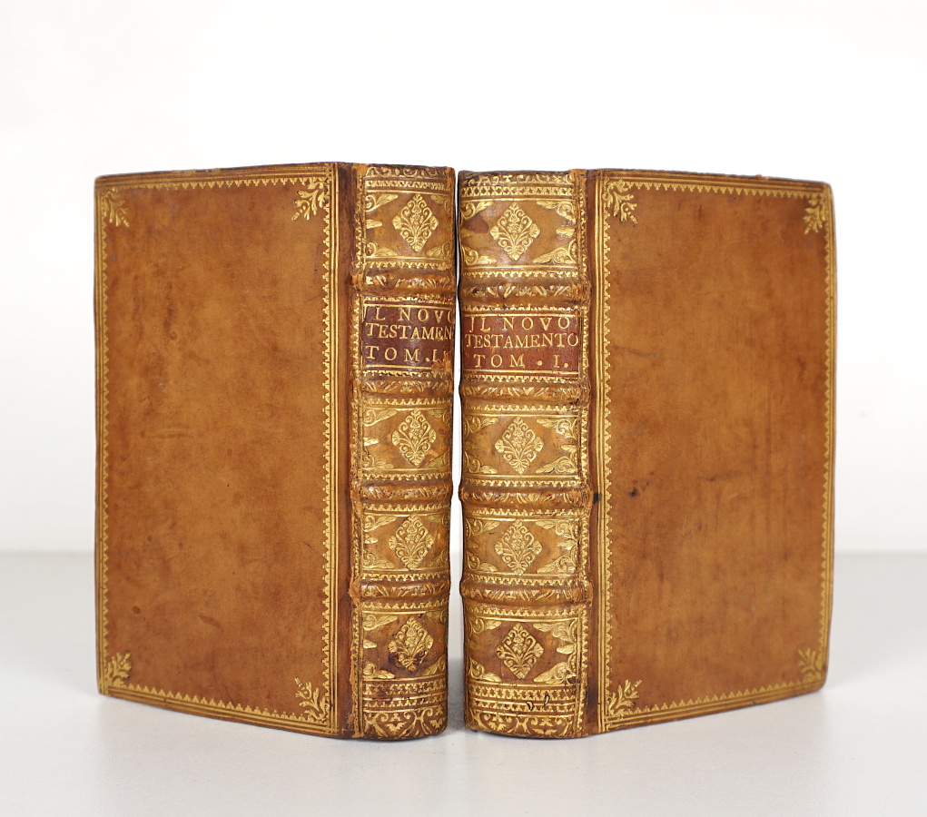 [BIBLE] - Il Nuovo Testamento di Giesu Christo Salvatore Nostro, nuovamente dal l'original fonte Greco in lingua Toscana tradotto - Lyone ; Gulielmo Rouillio [Guillaume Rouillé], 1553 - 2 volumes petit In-8° - 552, 374, [32] pages - Marges inférieures de 3 feuillets discrètement restaurées, 1 pâle auréole en marge de 3 feuillets - 114 bois gravés, la majorité in texte - Reliure début XIXème siècle veau fauve dans le goût du XVIIIème siècle - Plats encadrés d'1 triple filet fleuronné aux angles - Roulette aux coupes - Dos à nerfs ornés - Pièces de titre maroquin havane - Tranches rouges - Ex-libris gravé et armorié : A. Brölemann aux 1ers contre plats.