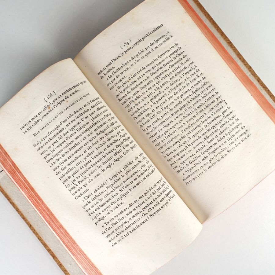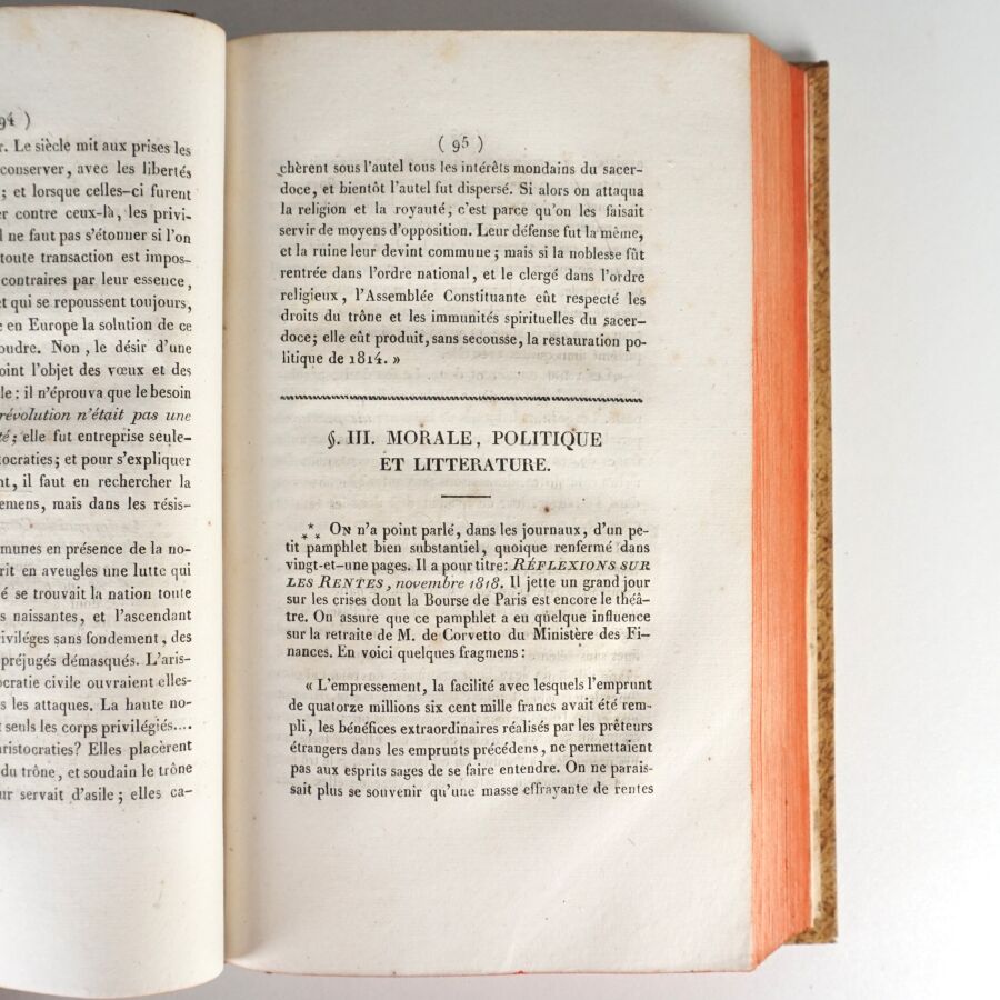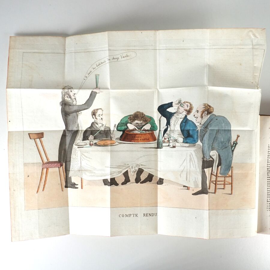 Bibliothèque royaliste. ou Recueil de matériaux pour servir à l'histoire de la Restauration de la maison de Bourbon en France, en 1814, 1815, etc. ; faisant suite au Correspondant. Paris, Gide fils, imprimerie Evrat, 1819-1820. 5 volumes in-8 demi-veau blond, dos lisses filetés or, p. de titre et de tomaison rouges et vertes, tr. rouges (reliure de l'époque). Avec les titres et prospectus des livraisons 1, 9, . Sans titre au troisième volume mais complet de la caricature dépliante gravée et aquarellée en frontispice.