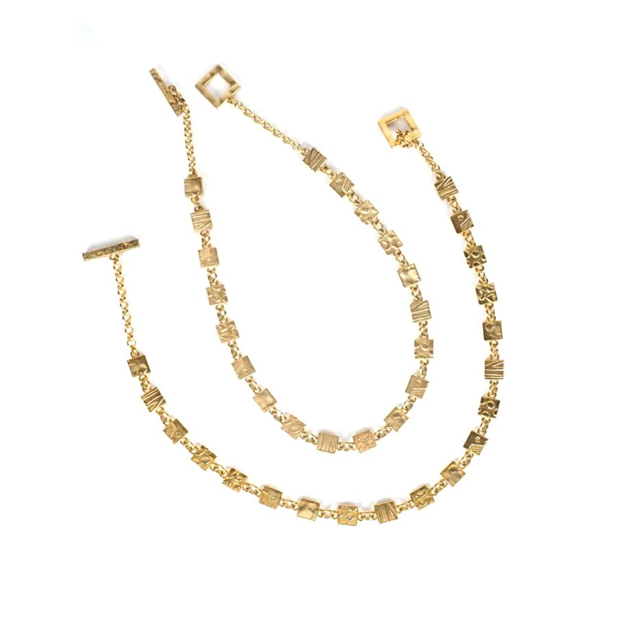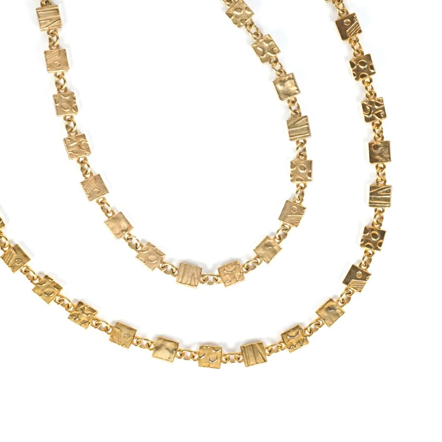 BICHE DE BERE : Deux colliers en métal doré, maillons de section carrée à décor stylisé, fermoir à crochet, signés, Larg. 1 cm. L.47 et 48.5 cm.