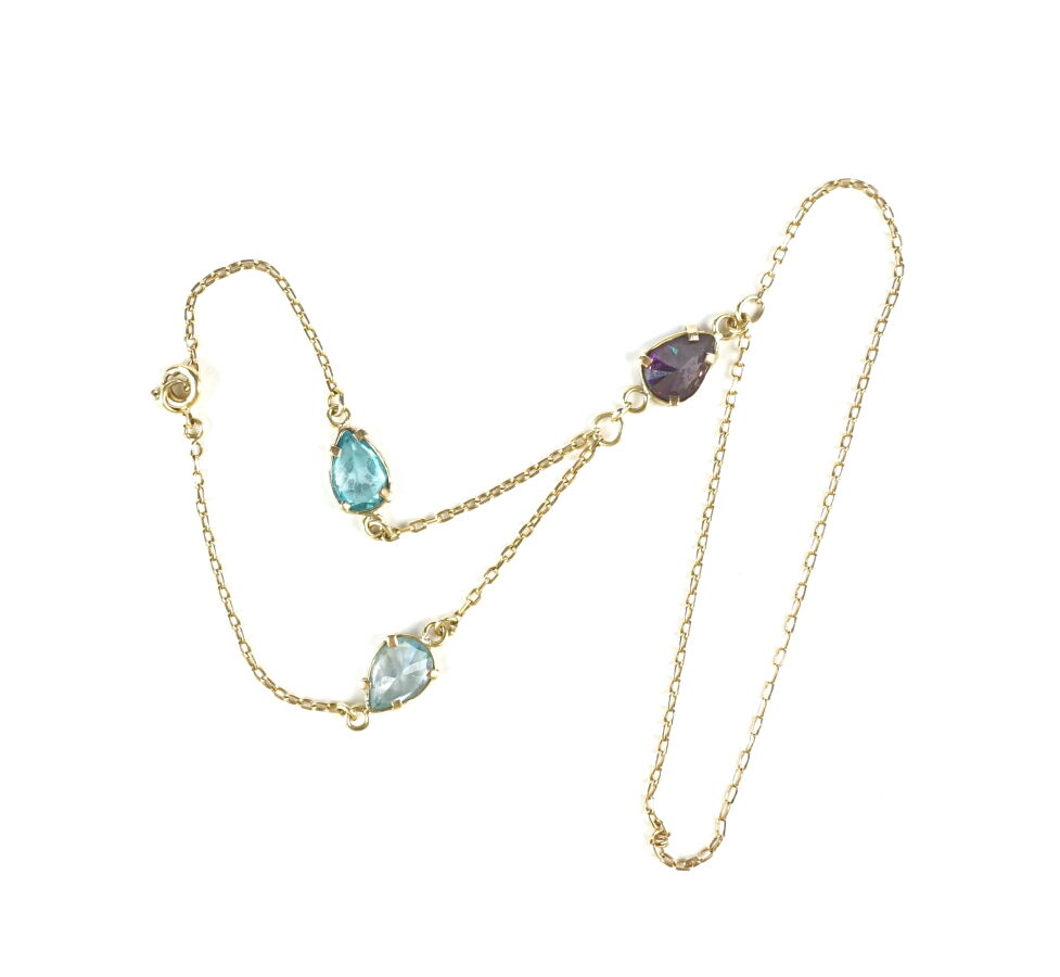 Bijou de main en or jaune 18K (750/oo), formé de chaines maille forçat, serties de pierres bleues et mauves taille poire, fermoir mousqueton. Tour de poignet : 18.5 cm. Poids brut : 6.2 g environ.