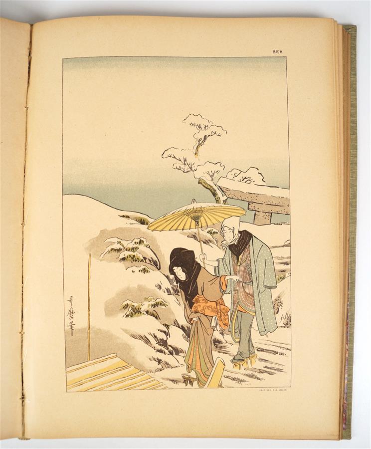 BING (Samuel) - Le Japon artistique. Documents d'art et d'industrie - Paris ; Japon Artistique, Marpon et Flammarion, sans date [1888-1891] - 3 volumes grand In-4° - 36 livraisons bien au complet (pages de sommaire des n° 4 et 5 manquants) - Textes de Théodore Dumet, Edmond de Goncourt, Hayashi, - Nombreuses planches en noir et couleurs hors texte et vignettes en noir (estampes, architecture, poteries, orfèvrerie, ) - 2 feuillets détachés au tome I - Reliure demi-percale vert d'eau à coins de l'éditeur - 1ers plats joliment illustrés couleurs - Couvertures non conservées - Dos titrés or ornés d'1 fleuron doré (celui du tome I légèrement décollé) - Têtes dorées - Bons exemplaires.
