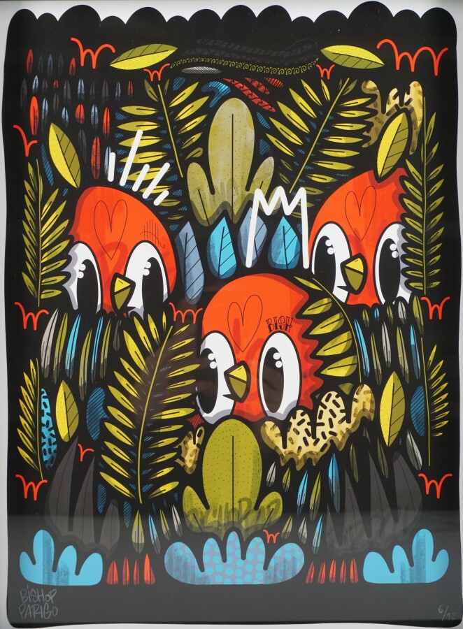 Guidé par un esprit résolument optimiste, Nicolas Poirier incite le spectateur à redécouvrir son âme d'enfant à travers des créations pop et pétillantes. Il affectionne tout particulièrement l'illustration jeunesse et les graffitis. Ce grand rêveur aime représenter l'humanité au travers d'animaux et petits monstres. Son dessin signature ? De petits oiseaux stylisés, symboles de paix et d'amour, qui nous font aborder le quotidien avec légèreté et simplicité ! En 2018, Bishop Parigo signe une apparition remarquée dans le clip des Enfoirés " On fait le show ", devant un mur du quartier Oberkampf à Paris, recouvert de ses petits oiseaux colorés. Considéré comme créateur touche à tout, l'artiste affirme son style partout, et sur tout ! Il teste de nombreux supports, des murs de la ville au scooter Lambretta et envisage de belles collaborations avec différentes marques telles que Vans, Posca, Casio G-shock, Nescafé Dolce Gusto, Eastpak