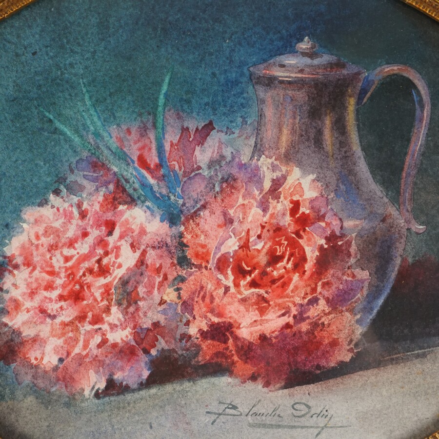 Blanche ODIN (1865-1957), « Nature morte aux fleurs rose et verseuse », aquarelle sur papier signée, 28.5 x 23.4 cm.