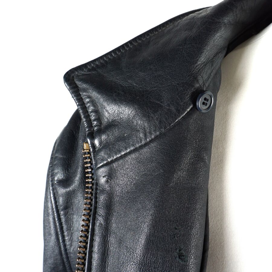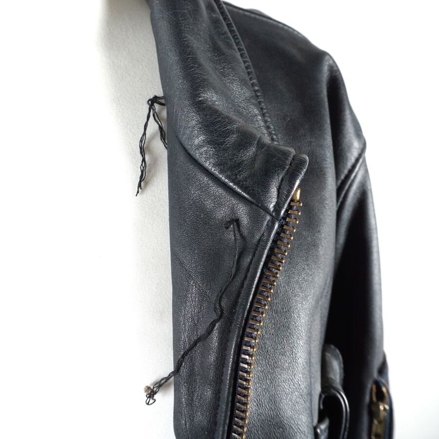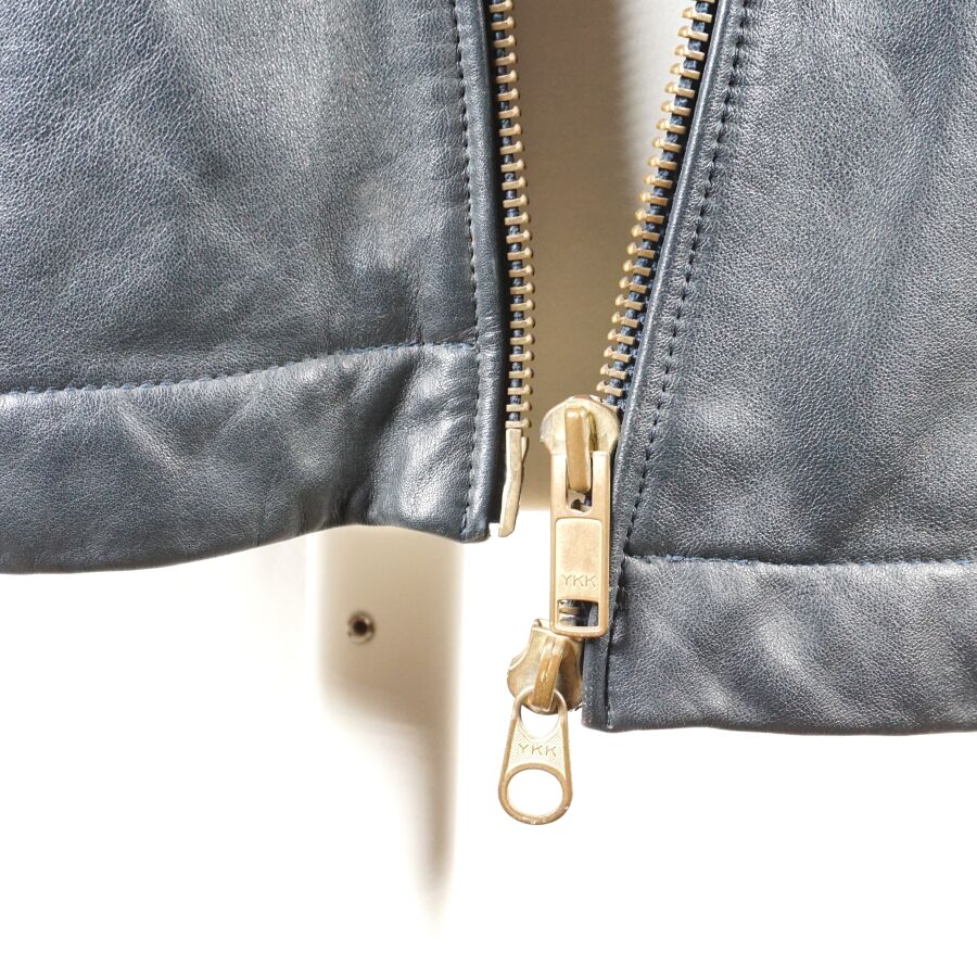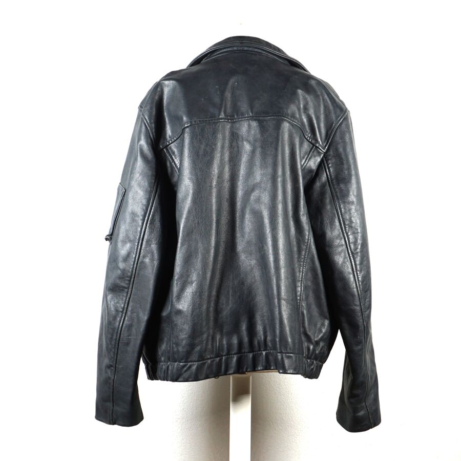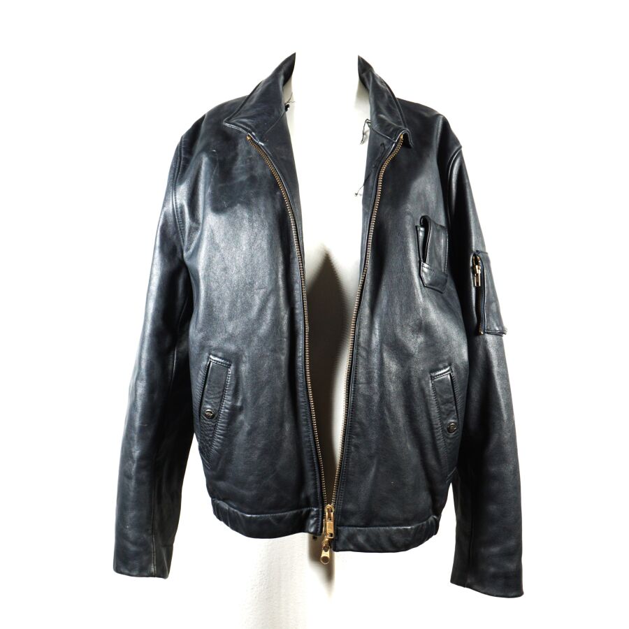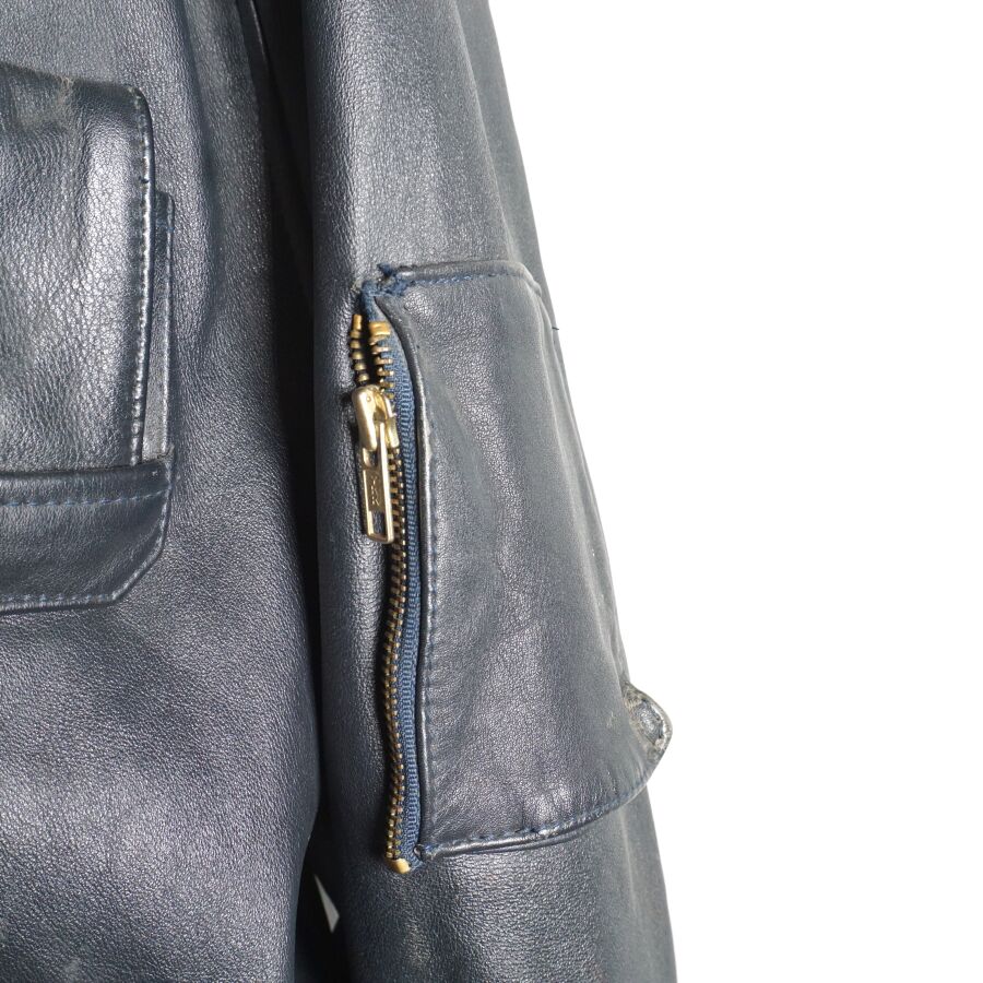 BLOUSON DE VOL pour PERSONNEL NAVIGANT en cuir de vachette bleu pétrole à doublure en coton, fermeture éclair YKK et boutons pressions, deux poches devant, 1 poche poitrine, 1 poche bras gauche et 3 poches intérieures, étiquette au col, taille probablement XL, dépourvue de sa doublure supplémentaire ainsi que son col et de sa pochette jaune, petites déchirures ou fils tirés, BE.