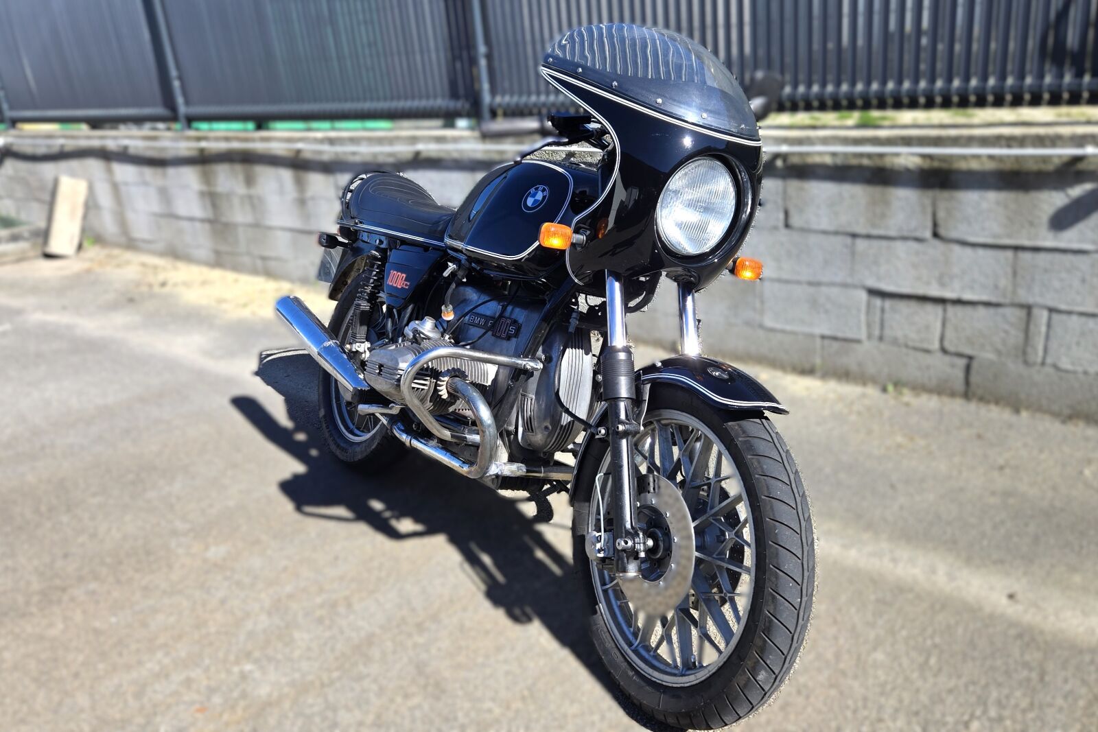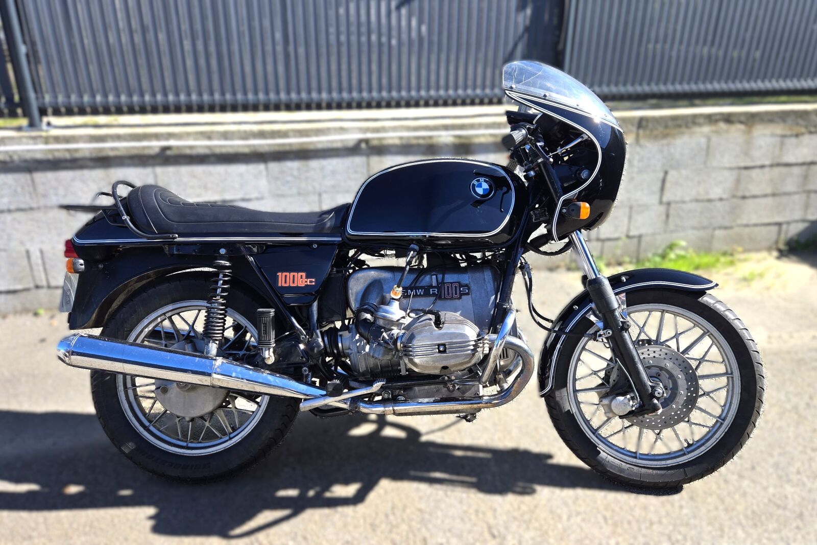 BMW type R100S du 22/06/1979, Motocyclette 2 places n° de série 6068182, carte grise française 25800 km au compteur, bon état d'origine, peinture neuve de couleur noire, filets blancs avec petit pare-brise coupe vent, selle double simili noir. Moteur 980 cm3, 2 cylindres à plat, 2 carburateurs Bing, entrainement par cardan. Jantes à rayons d'origine. Véhicule entretenu et à jour : Moteur, boite de vitesses, pneus etc…