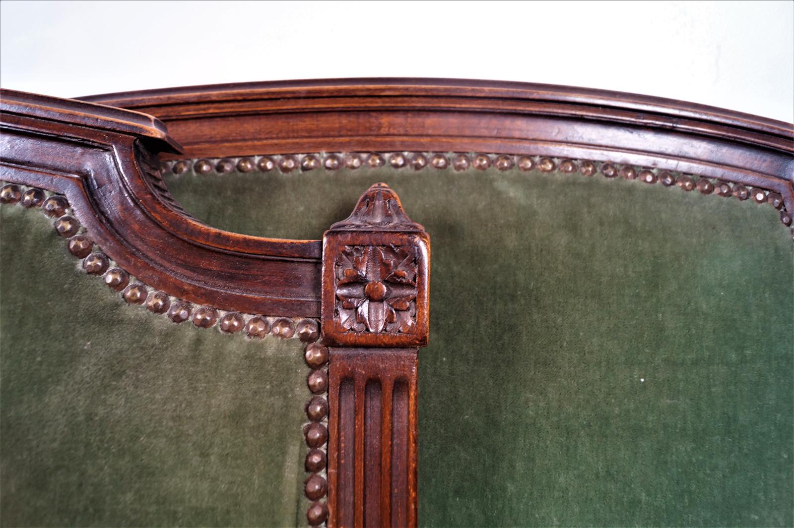 Bois de lit style Louis XVI en bois mouluré et sculpté, encadré de deux pilastres moulurés décorés de fleurettes dans des dés, garniture de velours vert, 205 x 79 x H. 94 cm (avec son cadre de lit).