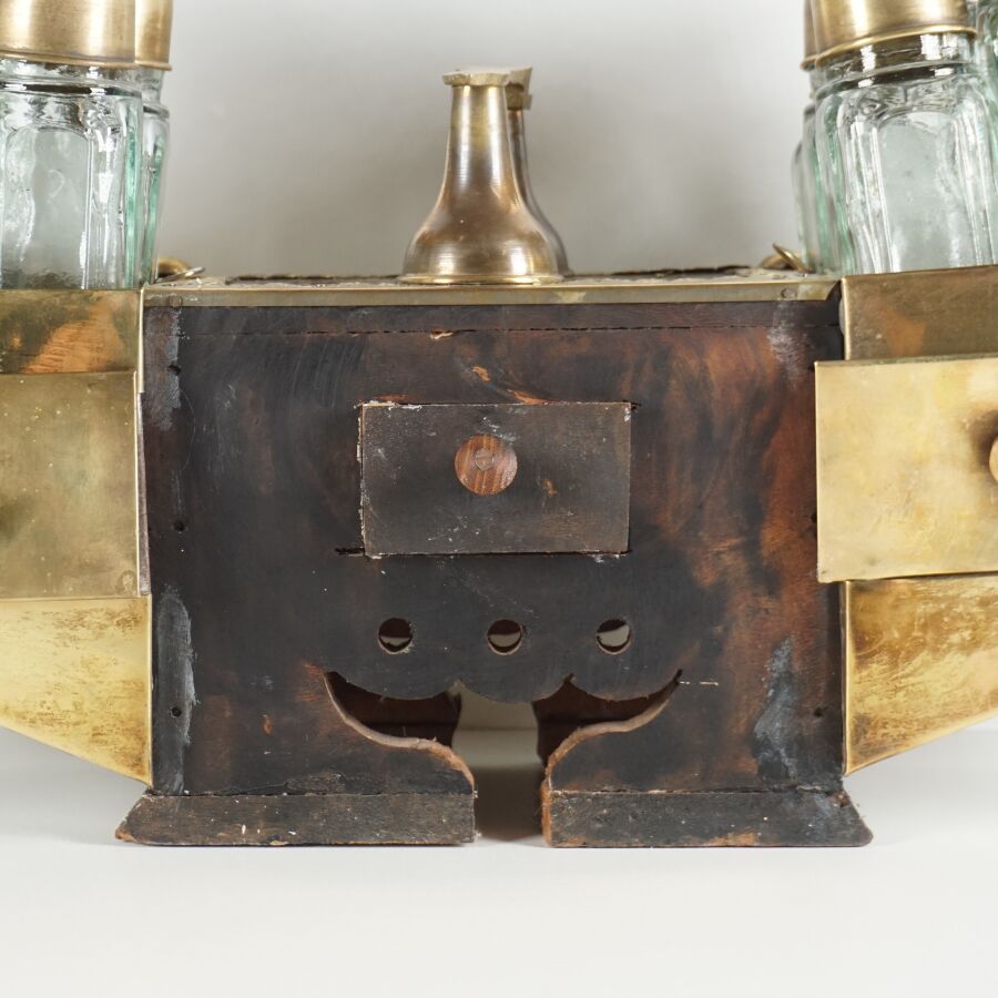 Boîte à cirage, âme en bois et laiton, agrémentée de compartiments et douze flacons, ainsi que tiroirs et logements pour les brosses, travail ottoman, H. 30 cm. L. 55 cm (quelques usures et légers enfoncements).