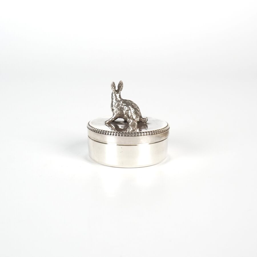 Boite à dents de lait de forme ronde, présentée avec son couvercle orné d'une frise de perles et surmonté d'un lièvre formant la prise, argent massif, poinçon Minerve 1er Titre, Dim. 3.2 cm. Poids brut : 30 g environ.
