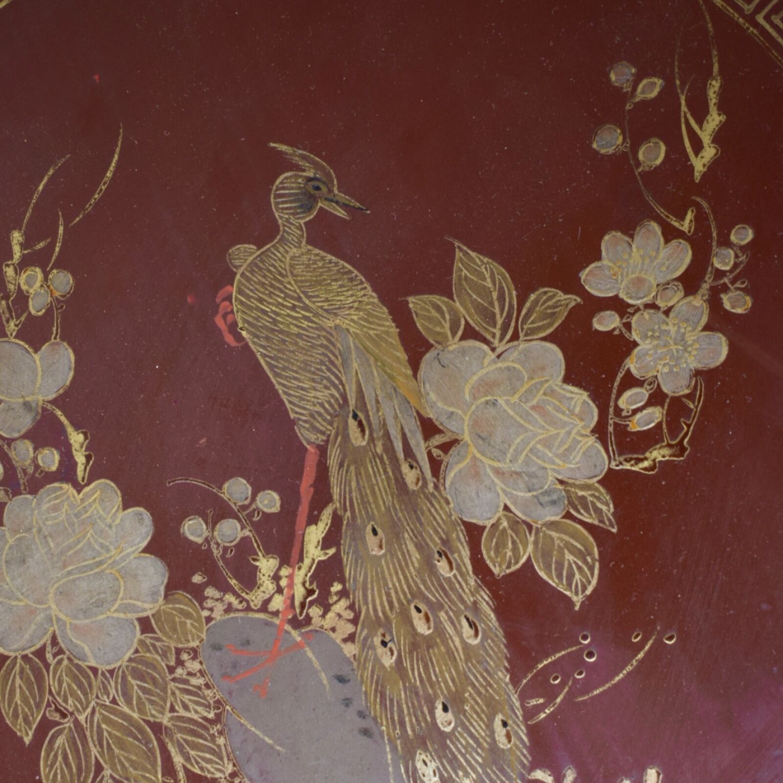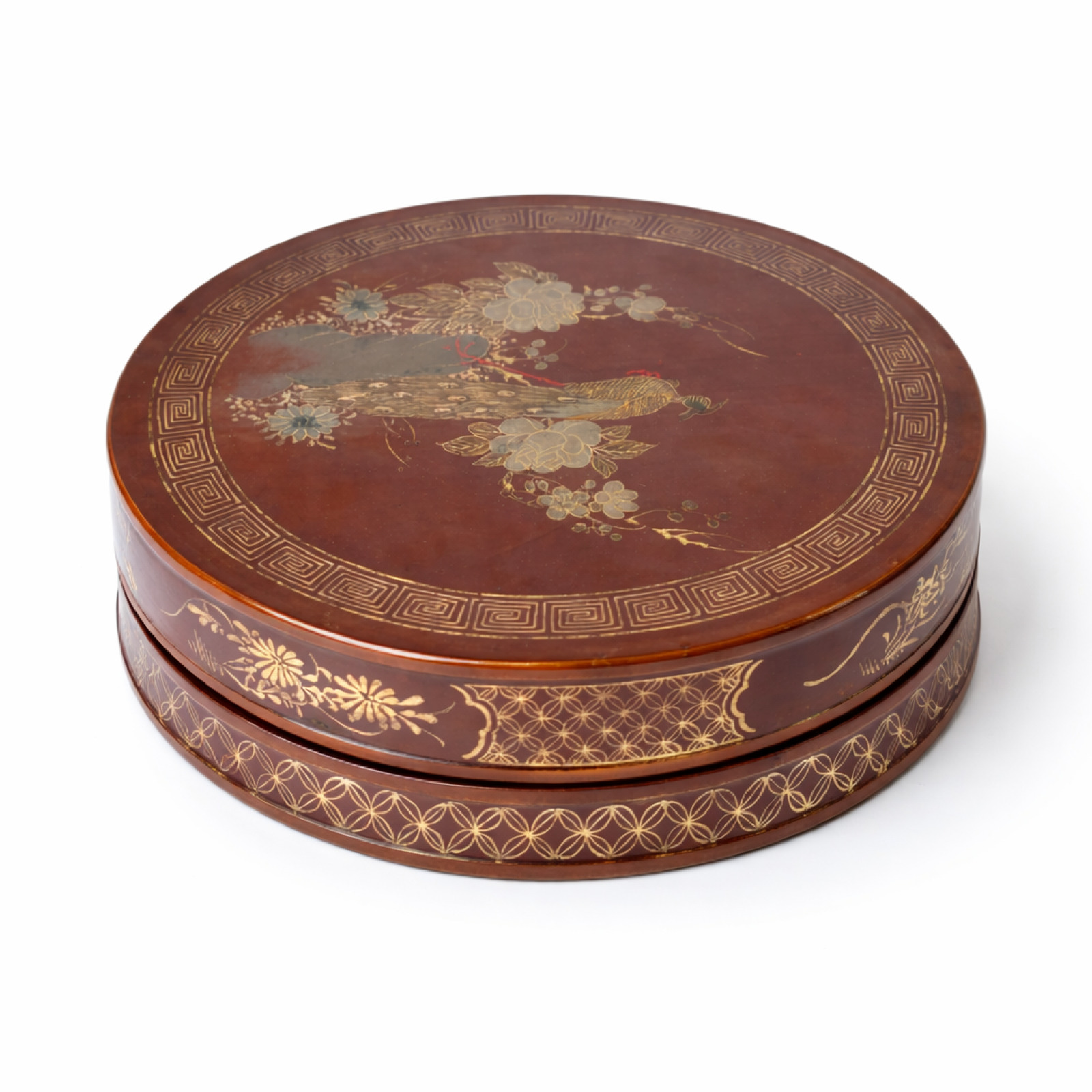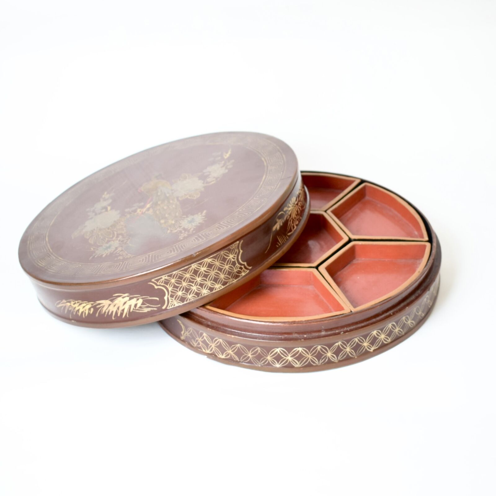 Boîte apéritif à sept compartiments en bois laqué à décor doré de fleurs et oiseaux dans le goût de l'Extrême-Orient, le couvercle orné d'un oiseau évoluant parmi des branchages fleuris et ceint d'une frise géométrique stylisée. Diam : 27.5 cm