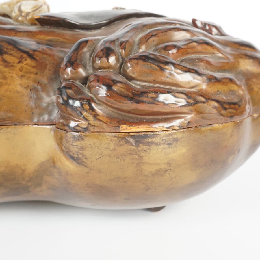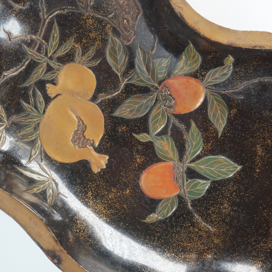 Boîte couverte à motif d'un citron digité dit "Main de Bouddha" en bois sculpté et laqué dans les tons brun clair et or, surmonté d'un second citron en nacre et d'un insecte, l'intérieur en laque or nuancé de vert reposant sur un fond aventurine représentant des grenades, litchis et tiges feuillagées, Chine, début du 20ème siècle, L. 39 cm (élément à recoller, petits sauts de laque).