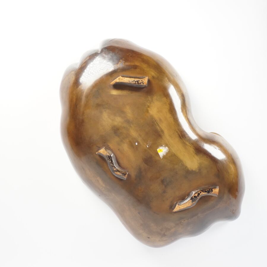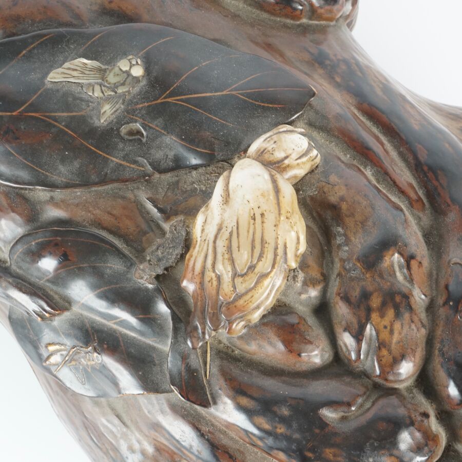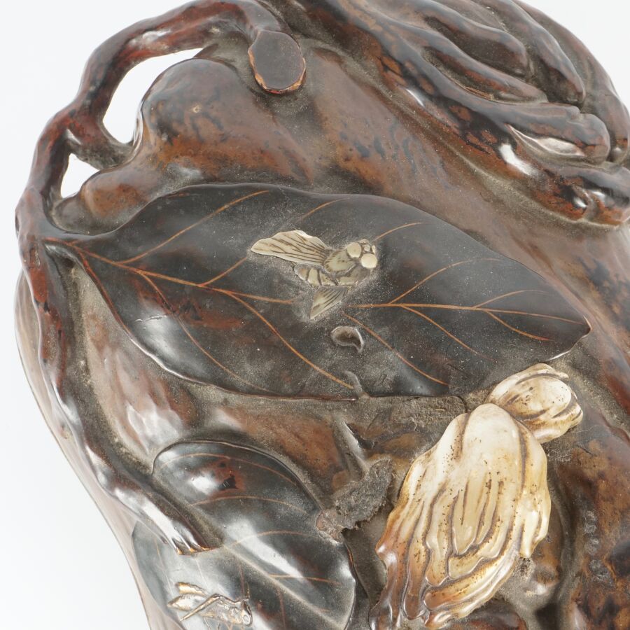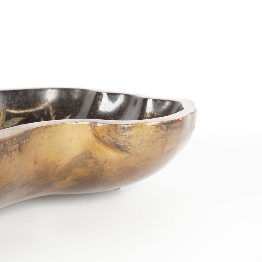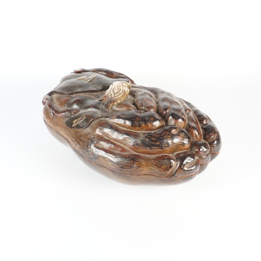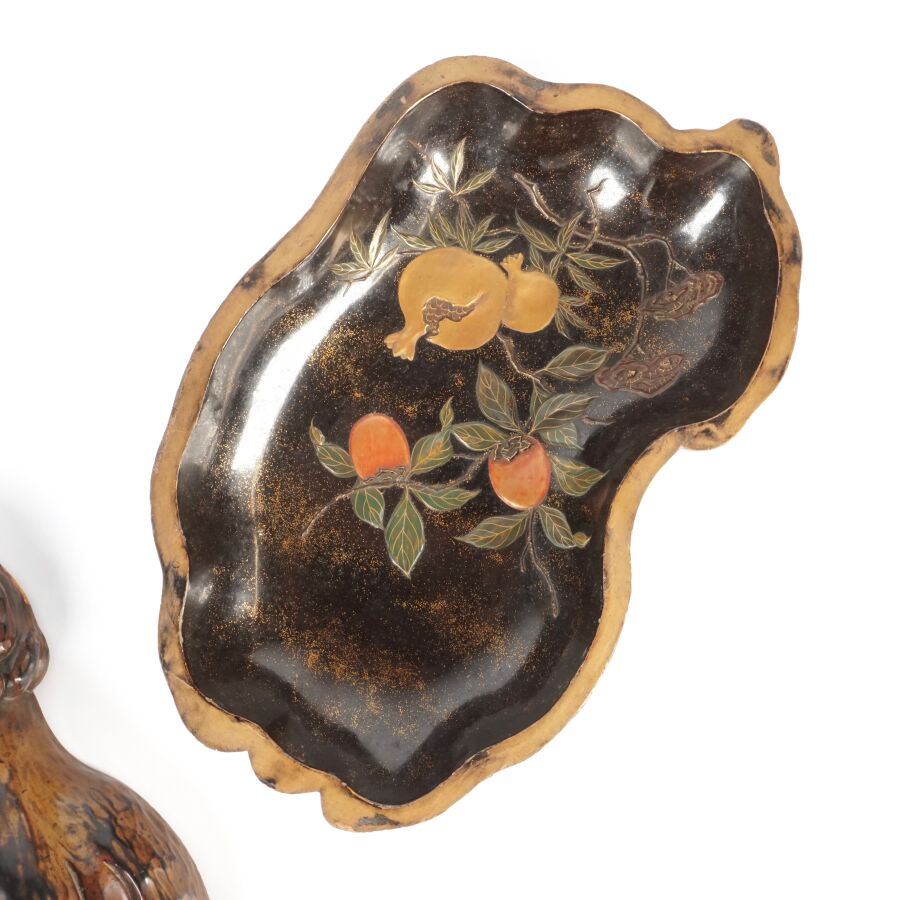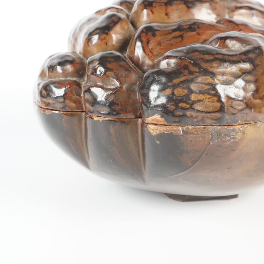 Boîte couverte à motif d'un citron digité dit "Main de Bouddha" en bois sculpté et laqué dans les tons brun clair et or, surmonté d'un second citron en nacre et d'un insecte, l'intérieur en laque or nuancé de vert reposant sur un fond aventurine représentant des grenades, litchis et tiges feuillagées, Chine, début du 20ème siècle, L. 39 cm (élément à recoller, petits sauts de laque).