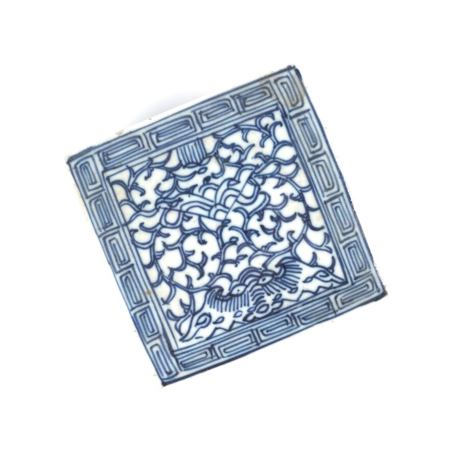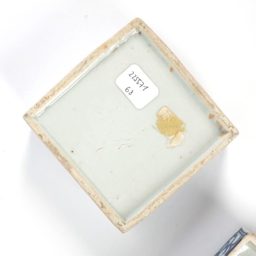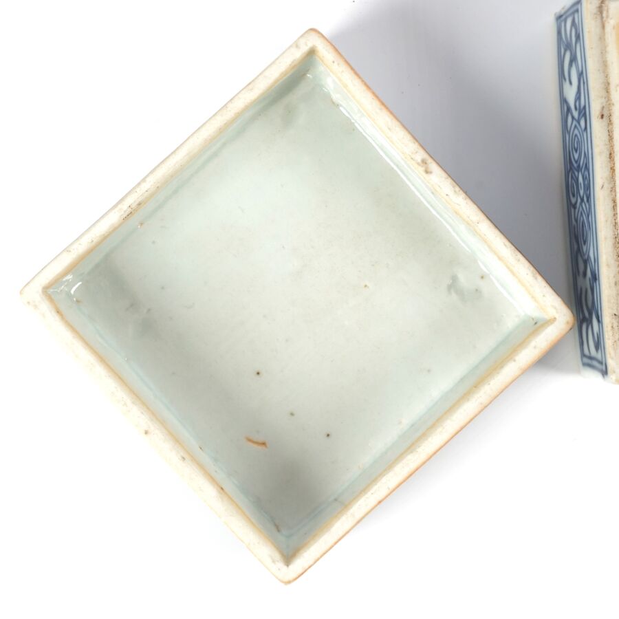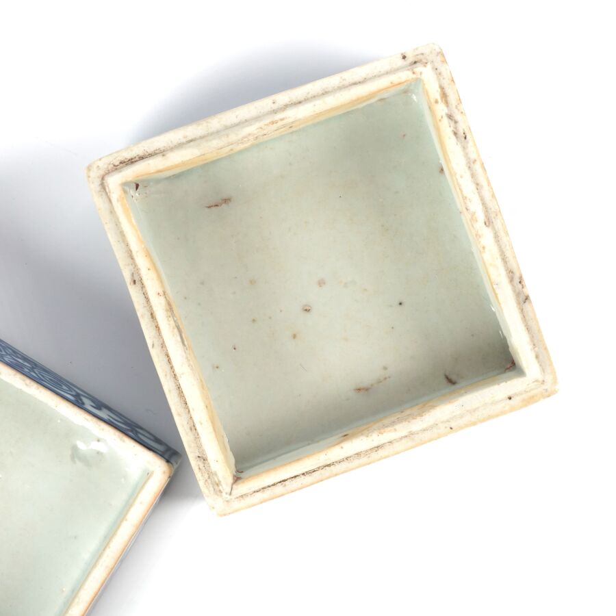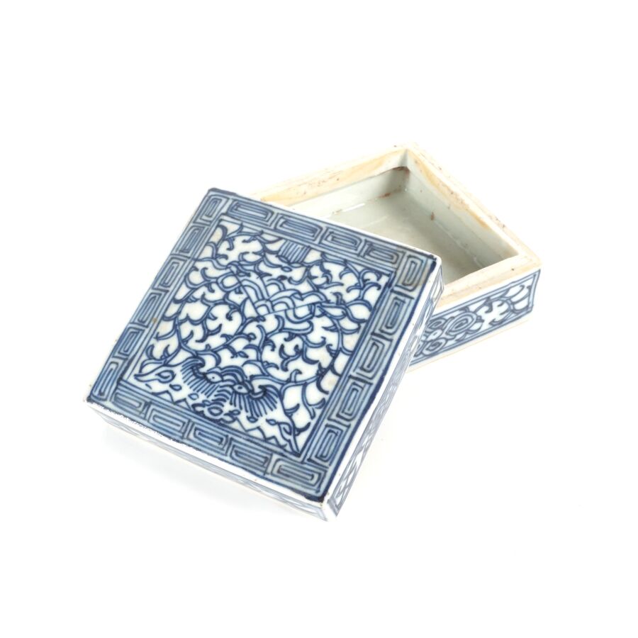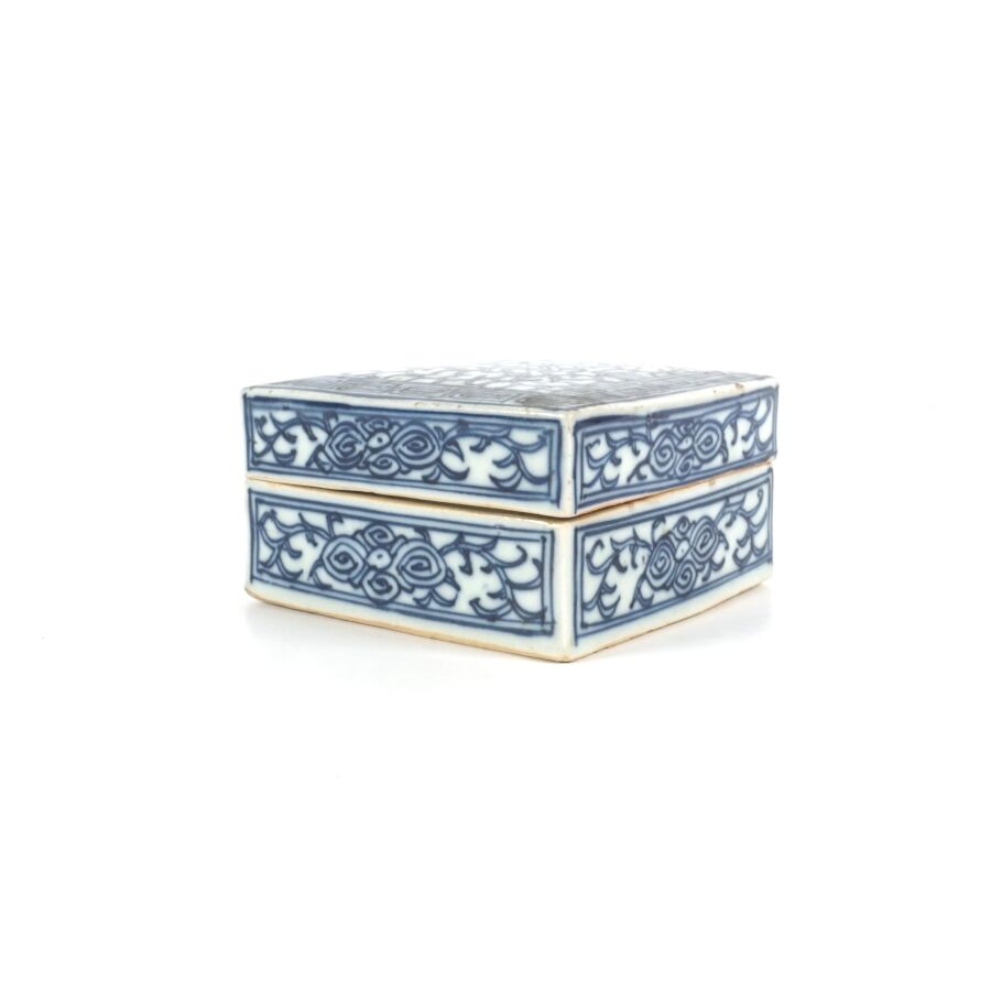 Boîte quadrangulaire en porcelaine émaillée bleu blanc à décor de rinceaux feuillagés, Chine, 19ème siècle, Dim. 4.8 x 8.6 x 8.5 cm (petit éclat au couvercle).