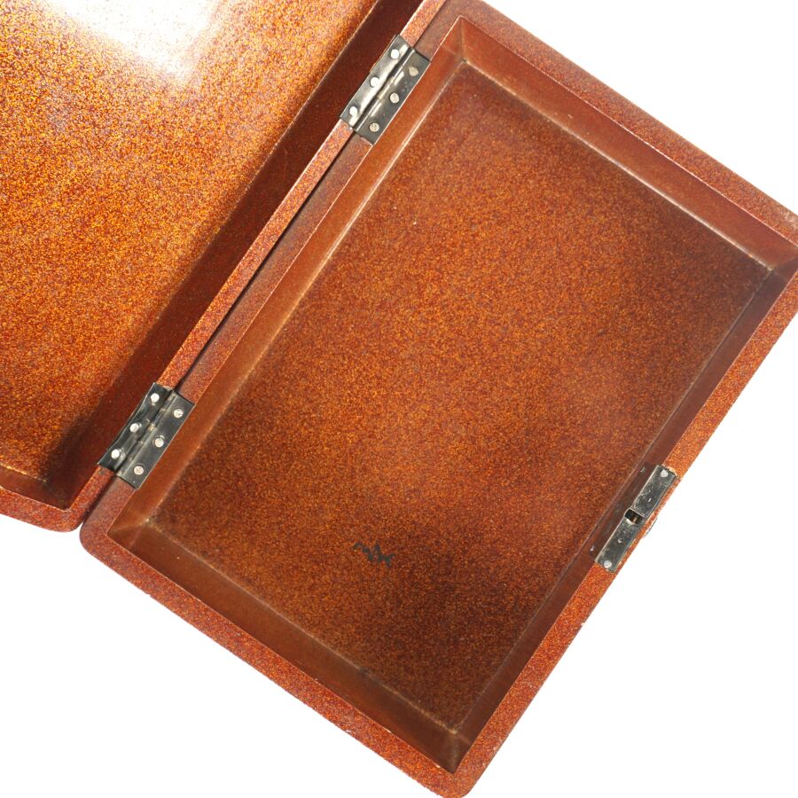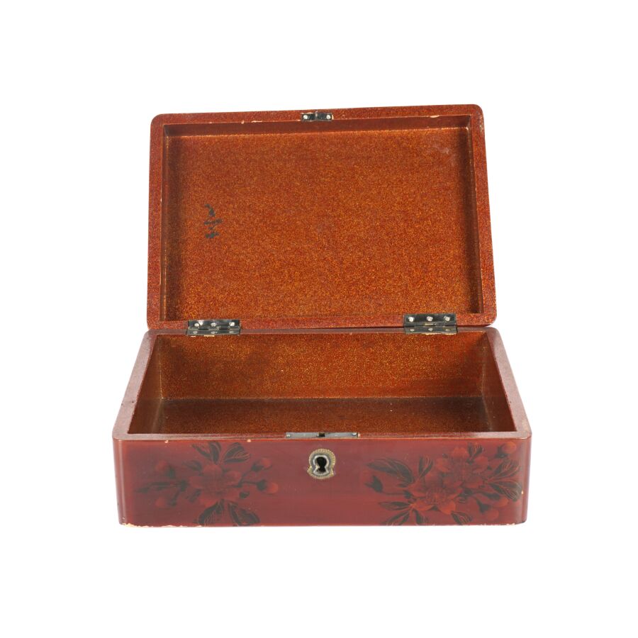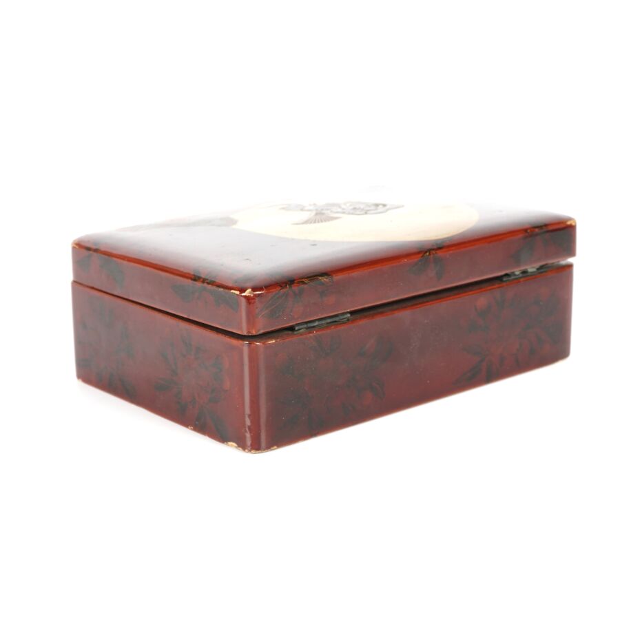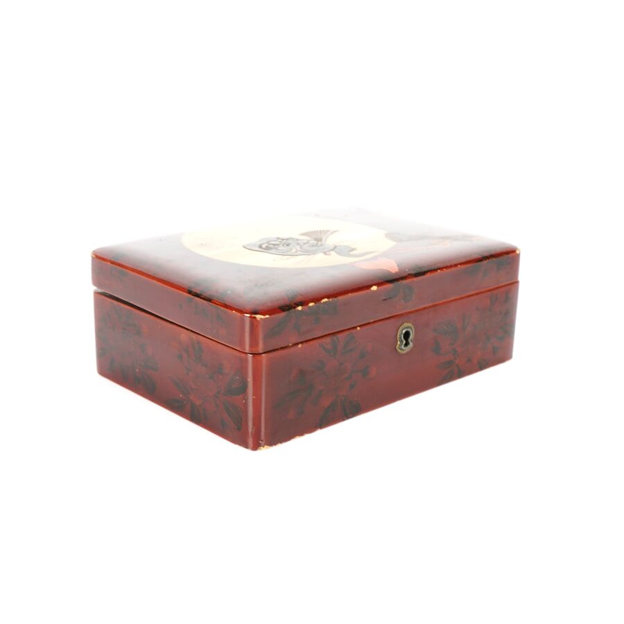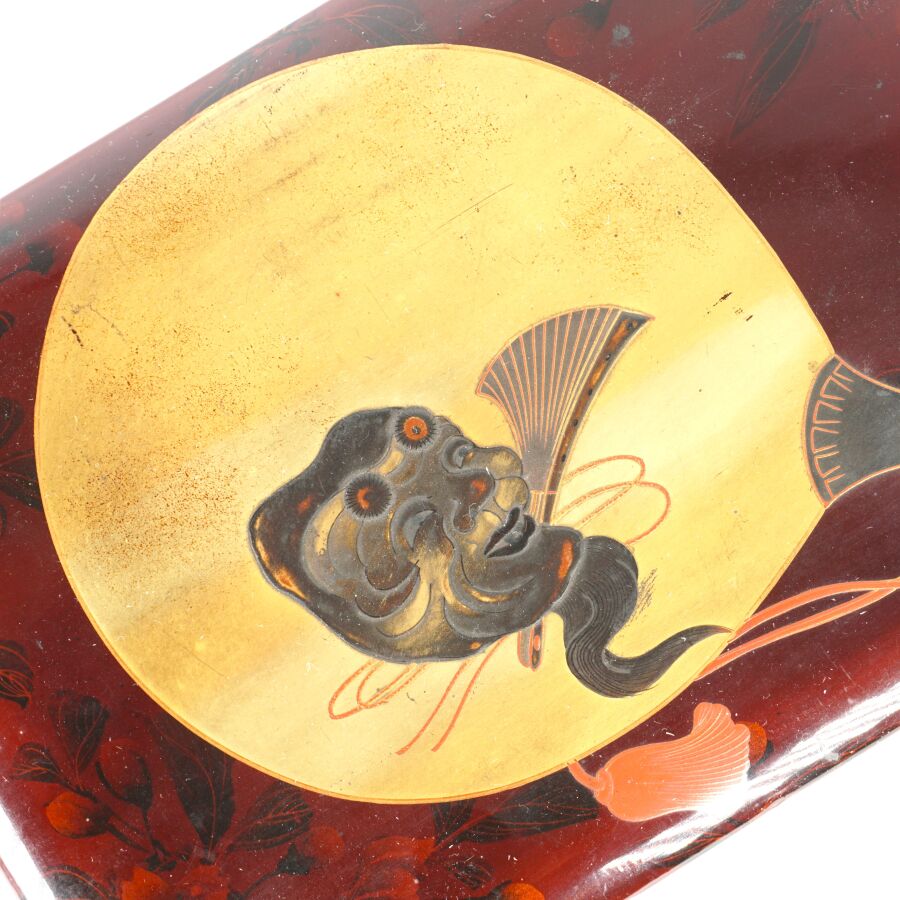 Boîte rectangulaire en laque, le couvercle ornée d'un masque et d'un éventail, intérieur aventurine, Japon, circa 1930-50, Dim. 7 x 21 x 14.3 cm (quelques sauts d'émail, sans clé).