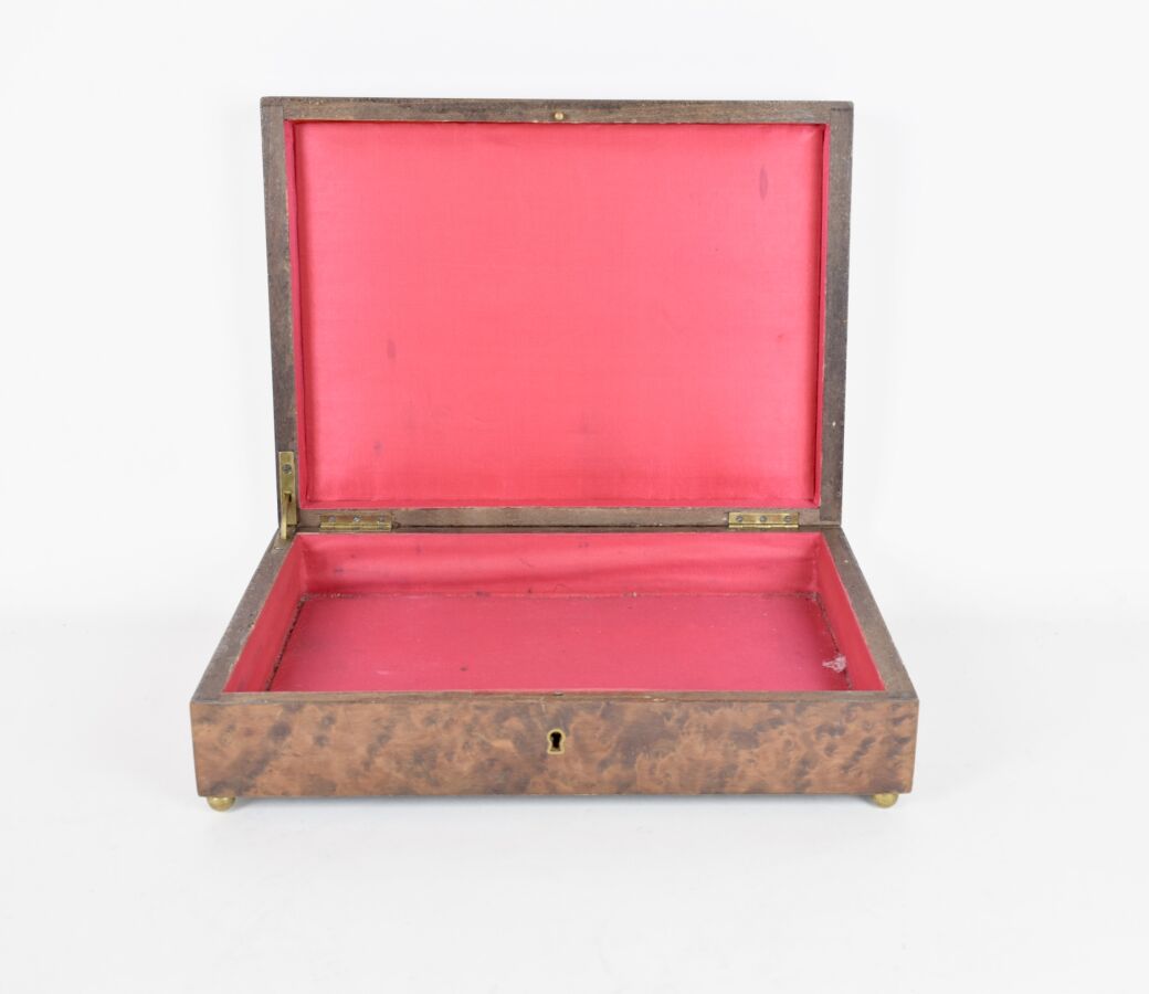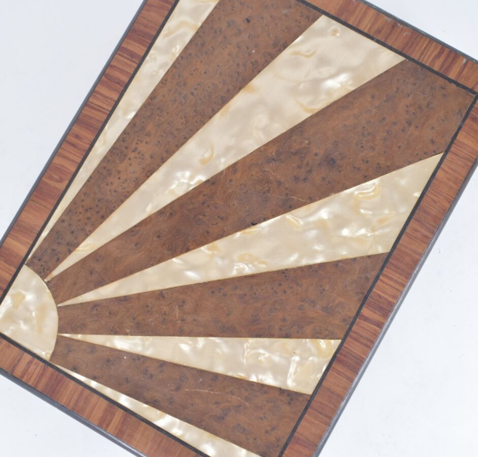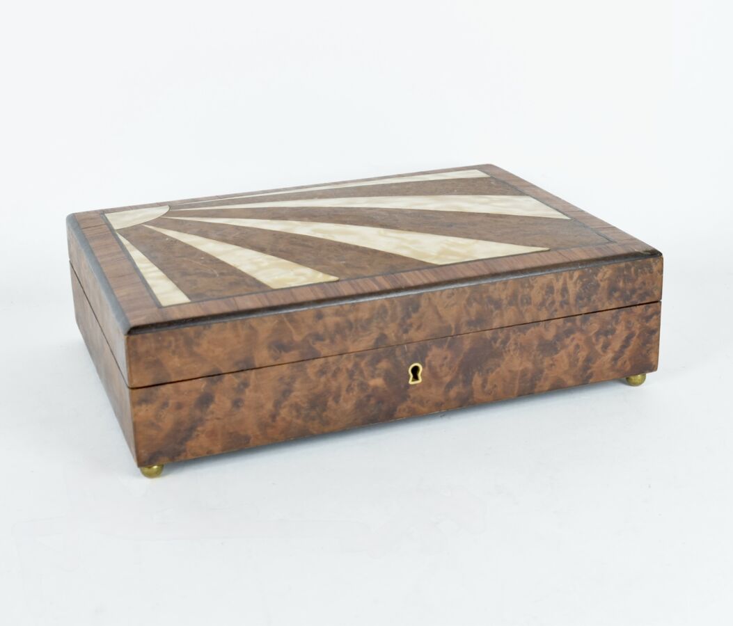 Boîte rectangulaire en placage de bois, le couvercle orné d'un motif de soleil levant en marqueterie alternant placage de loupe et incrustations de nacre, souligné de filets noirs dans un encadrement de palissandre, la panse plaquée de loupe de noyer, l'intérieur en feutrine rouge, le tout reposant sur quatre pieds sphériques dorés. Dim. 27.5 x 20.5 x 7 cm. (manque la clé, petite tâche à l'intérieur, usures et tâches sur le bois).