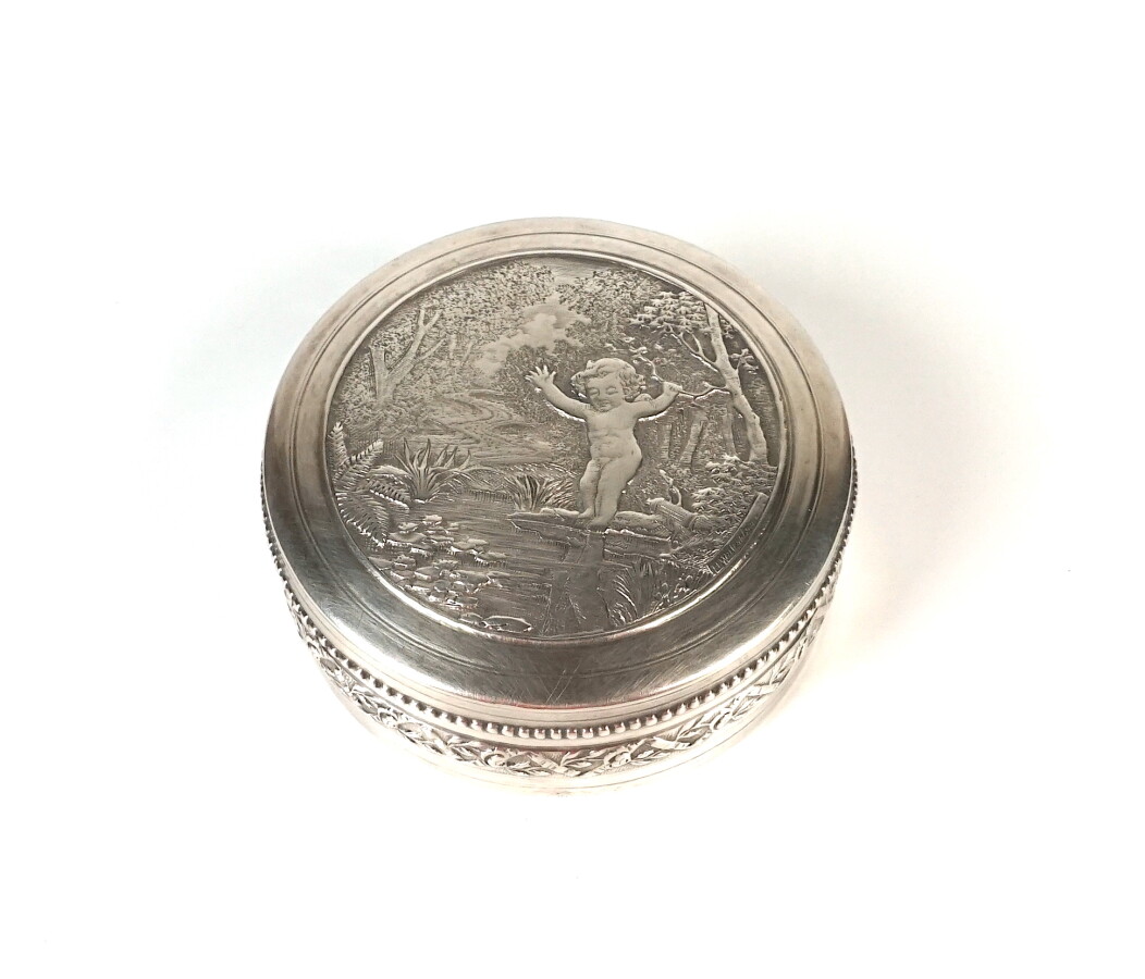 Boîte ronde en argent, poinçon Minerve 1er titre, à décor en léger relief d'un chérubin accroché à une branche près d'un point d'eau, d'une frise de perle et d'une frise de fleurs et rubans, D. 6.5 cm. Poids brut : 48 g environ.