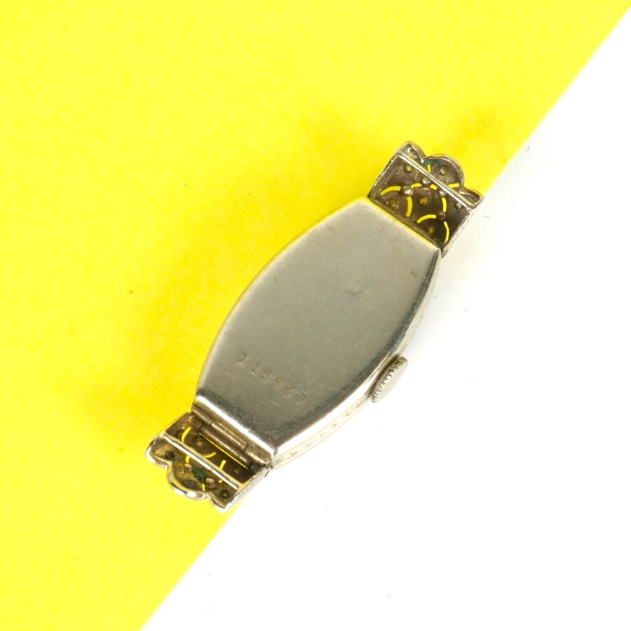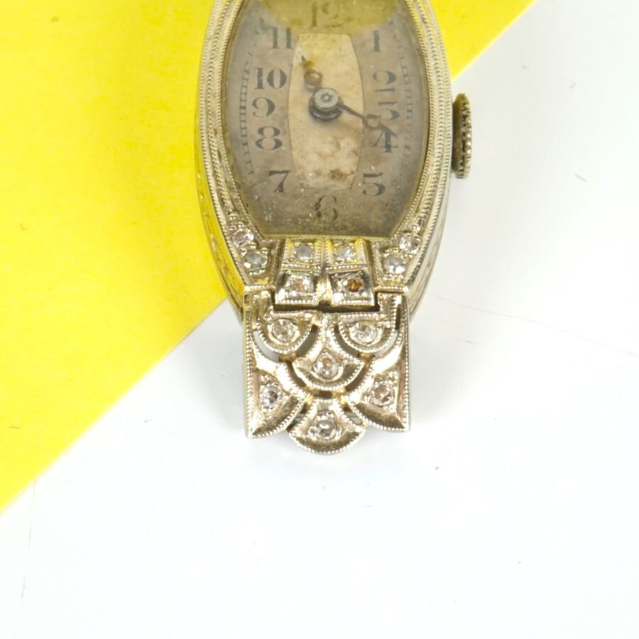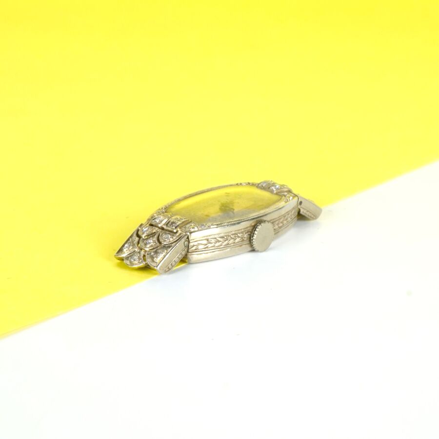 Boîtier de montre en or gris 18K (750/oo), poinçon hibou, cadran de forme tonneau, fond gris-nacré, chiffres arabes pour les heures, encadrement ciselé, orné de 2x8 diamants taille ancienne, les montants articulés sertis de 2x6 diamants taille ancienne, L. Totale : 3.7 cm. Larg. 1.5 cm. Poids brut : 9.3 g environ (sans bracelet, usures d'usage).