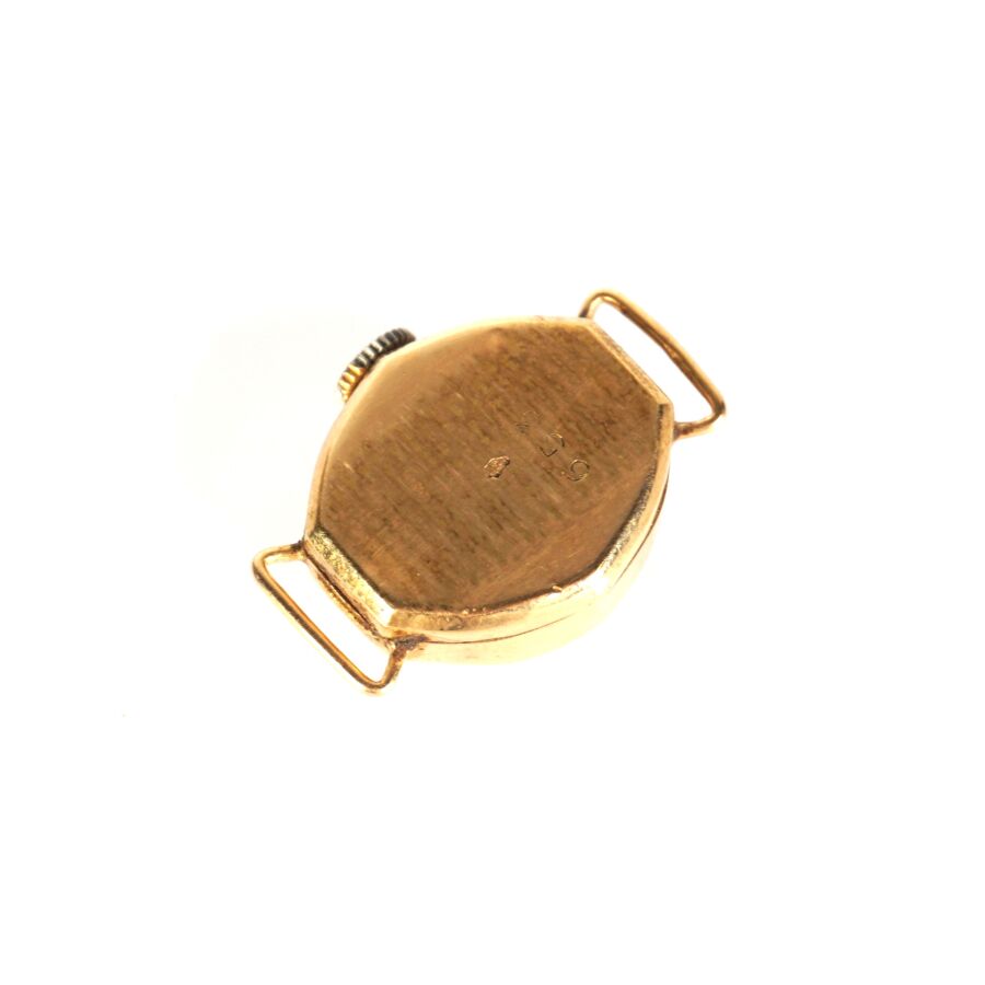 Boîtier de montre en or jaune 18K (750/oo), fond beige nacré signé, chiffres arabes et index appliqués pour les heures, fond à clip numéroté 6535, Diam. Boîtier : 1.5 cm. Poids brut : 4.8 g environ (petites usures d'usage).
