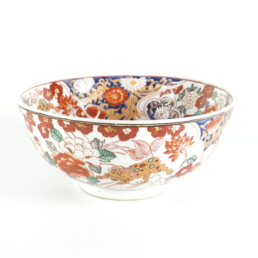 Bol à punch en porcelaine et émaux de style famille verte à décor d'une chauve-souris et chrysanthèmes, marque au revers, Japon, 20ème siècle, travail décoratif moderne, D. 25.5 cm.