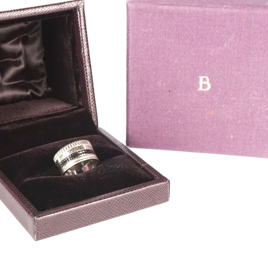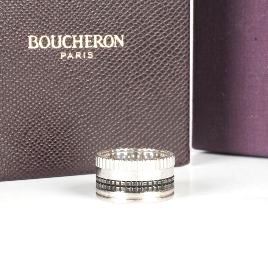 BOUCHERON : Bague modèle "Quatre", Black édition, en or gris 18K (750/oo) et PVD noir, signée à l'intérieur, présentée dans son écrin d'origine, Larg. 1.1 cm. TDD. 56. Poids brut : 14.4 g environ (petites rayures d'usures).