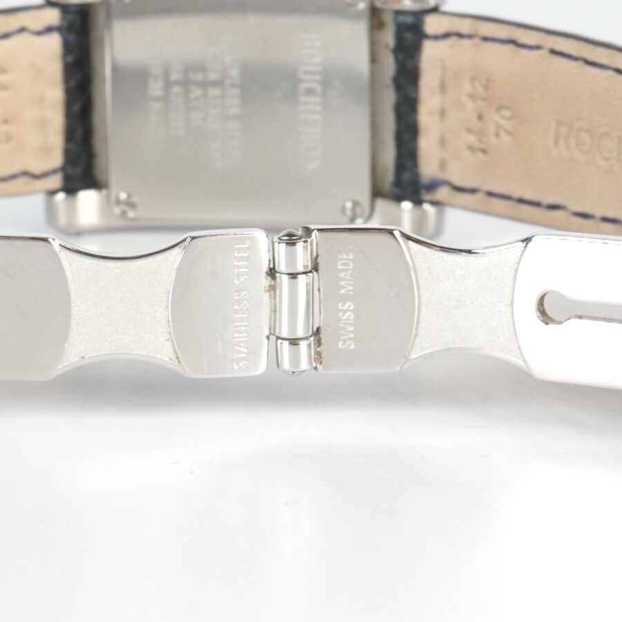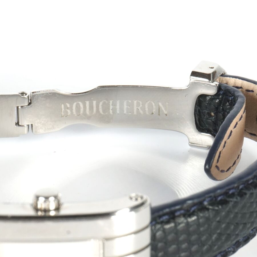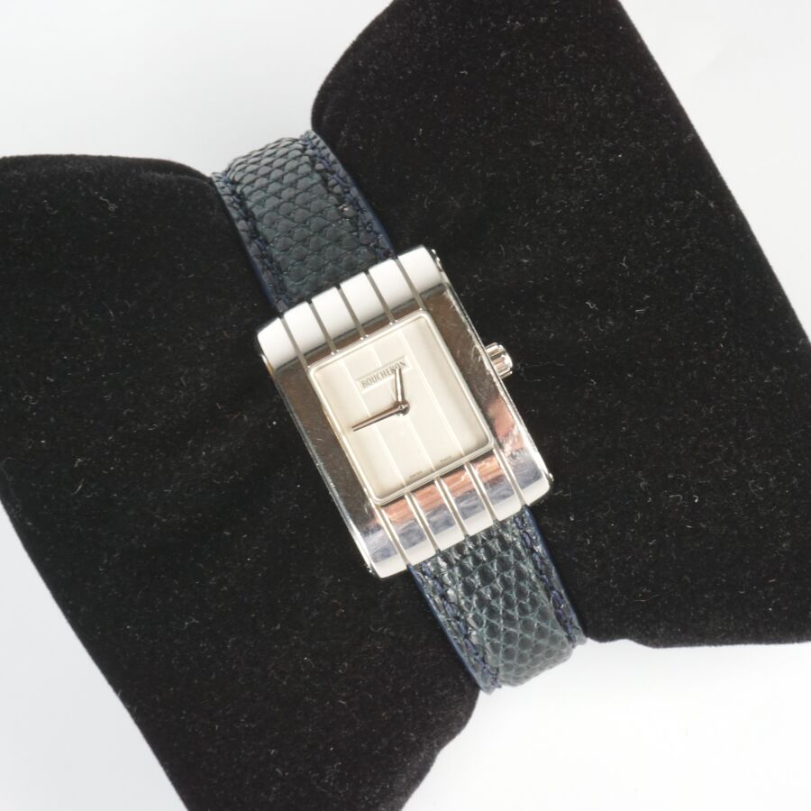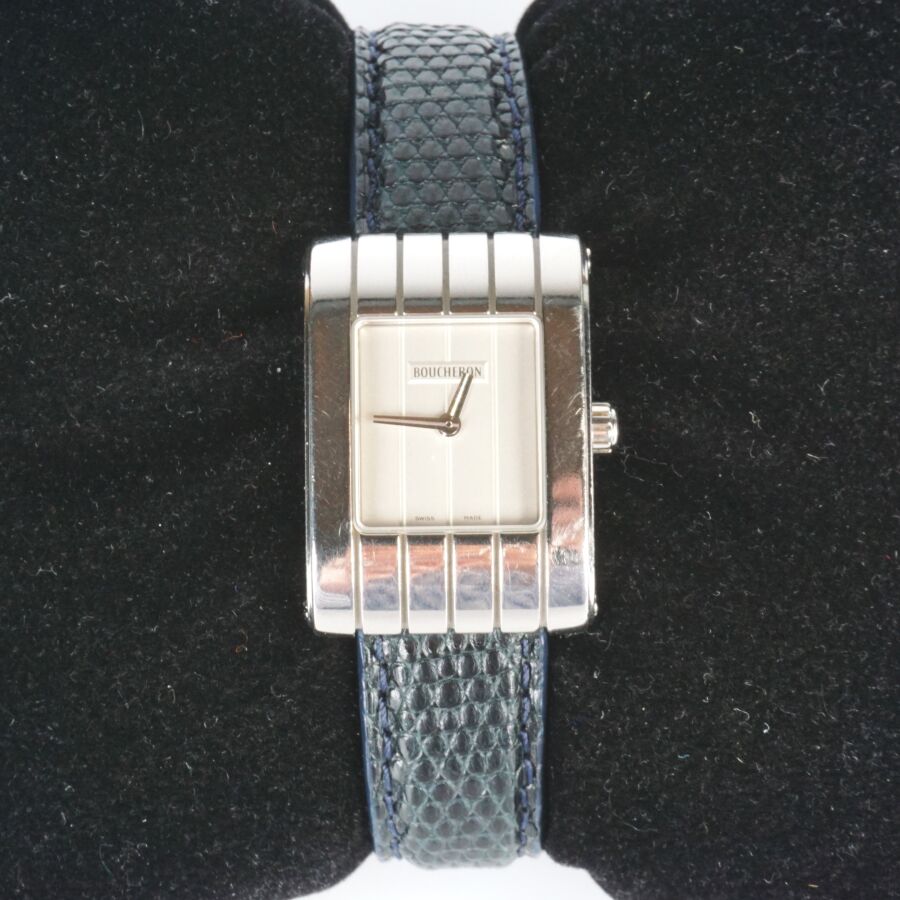 BOUCHERON : Montre bracelet modèle "Reflet", acier chromé, cadran de forme rectangulaire nacré rainuré, fond à vis signé et numéroté, bracelet en cuir non d'origine, boucle déployante signée, Dim. Boîtier : 3 x 2 cm. Dim. Cadran : 1.5 x 1.3 cm. Tour de poignet : 5/6 cm environ (petites usures d'usage).
