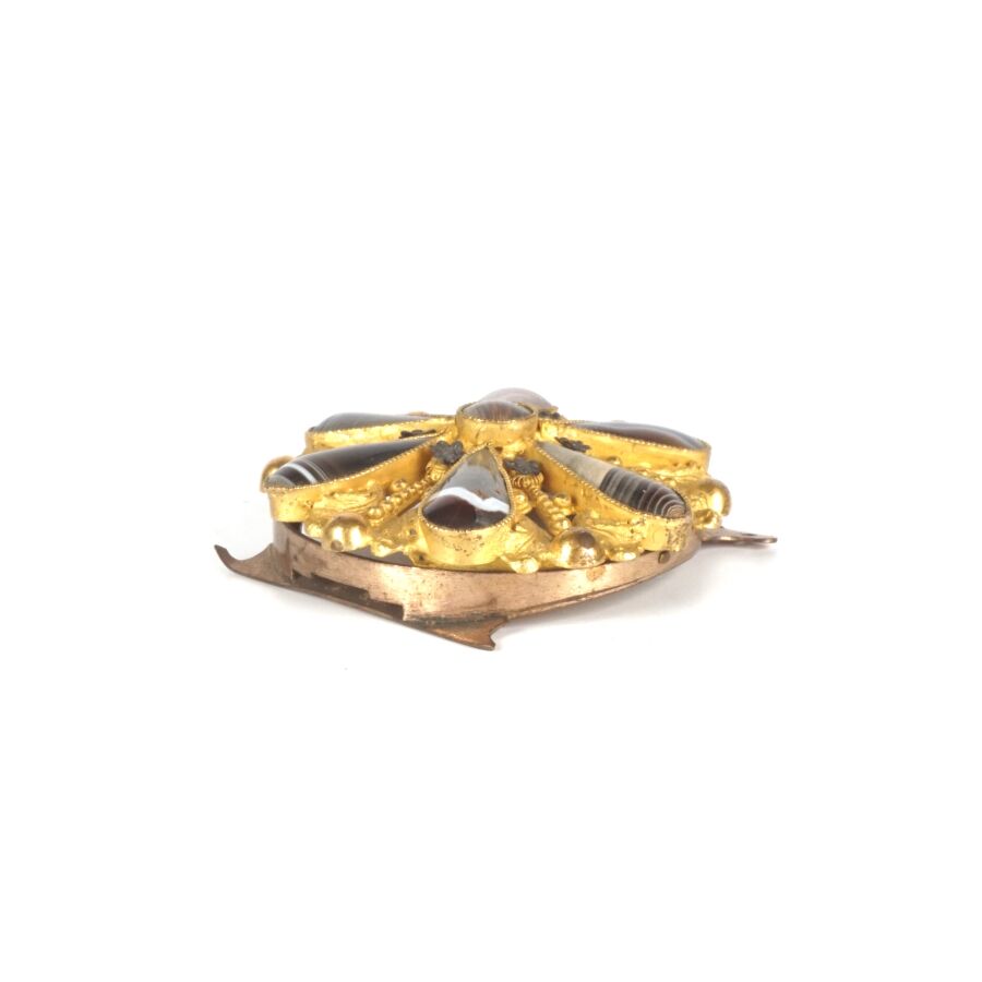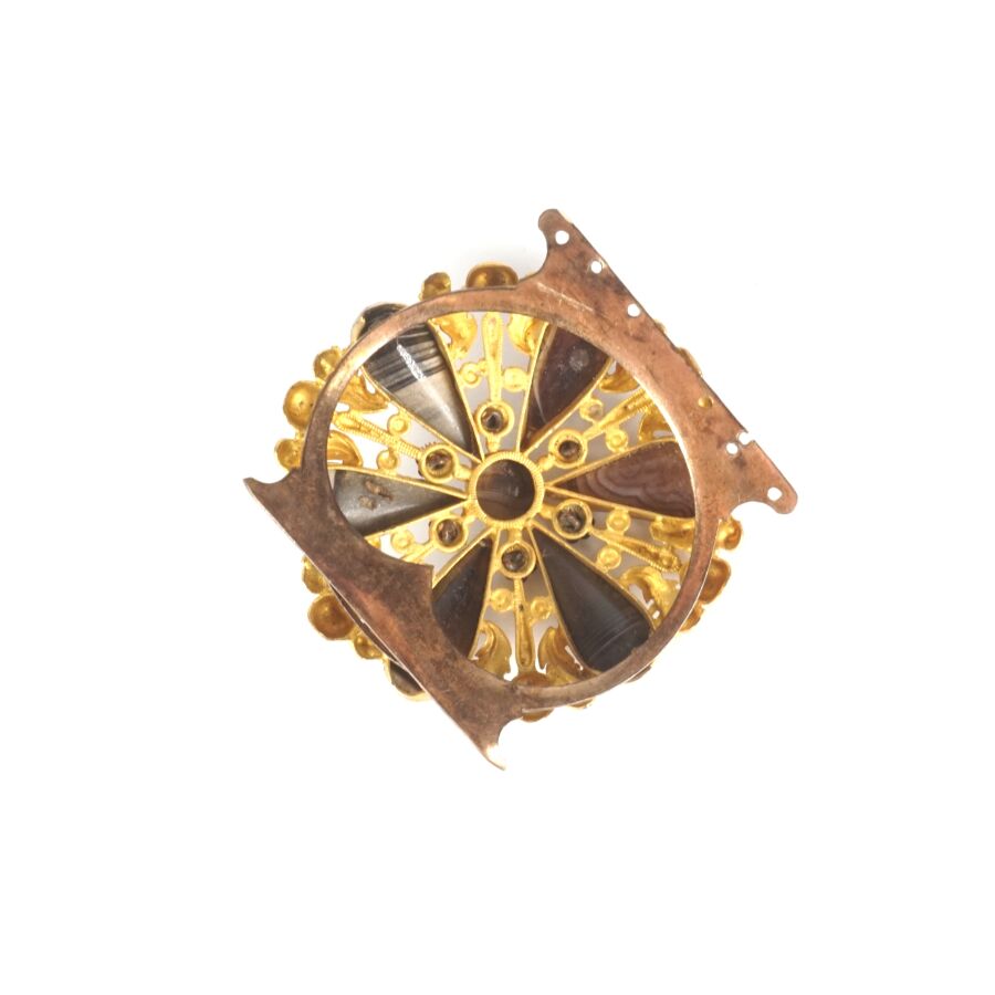 Boucle en métal doré à motif d'une rosace ajourée et stylisée composée de six pétales et d'un pistil sertis clos de pierre dure, probablement de l'agate brune, Dim. 4.5 x 4.5 cm. Poids brut : 16.7 g environ.