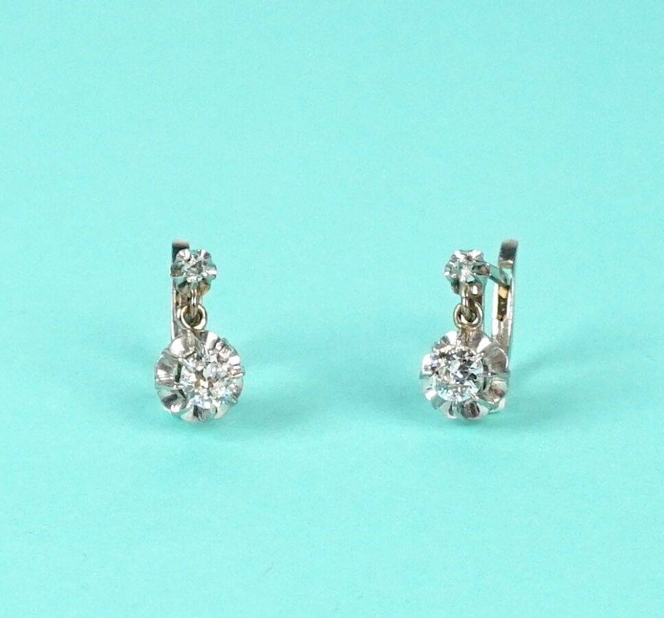 Boucles d'oreilles "Dormeuses" en or gris 18K (750/oo) et platine (850/oo), serties chacune d'un petit diamant rond taille moderne calibrant 0.20 carat environ surmonté d'un petit diamant taille rose, H. 1.2 cm. Poids brut : 2.6 g environ.