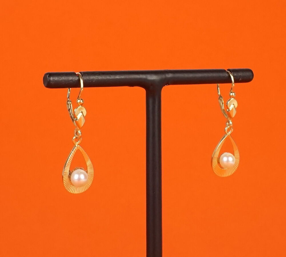 Boucles d'oreilles "Dormeuses" pendantes en or jaune 18K (750/oo), retenant un motif de goutte ajourée à décor rayonnant, serti au centre d'une perle, H. 3 cm. Poids brut : 1.7 g environ.