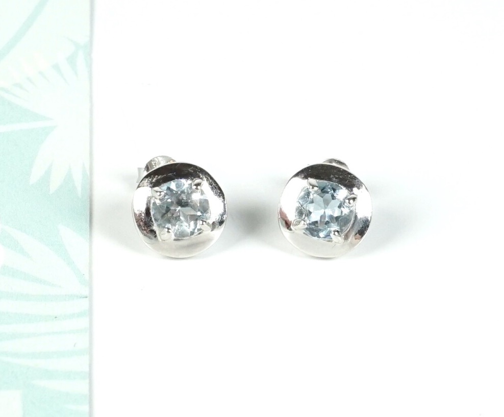 Boucles d'oreilles rondes en argent (925/oo) sertie au centre d'une topaze bleue, D. 1 cm. Poids brut : 2.3 g environ.