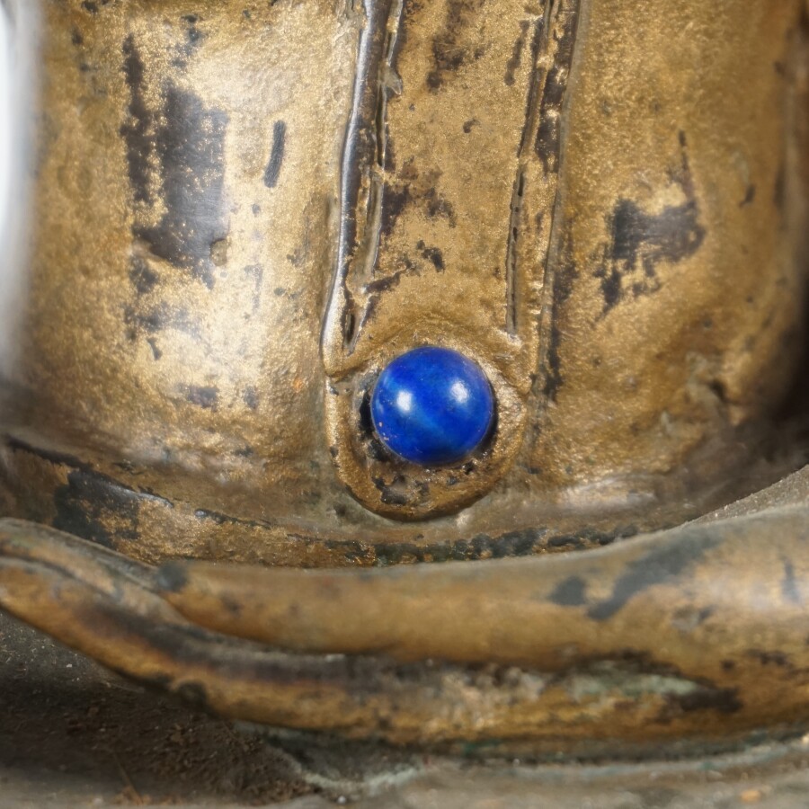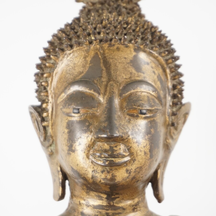 Bouddha assis en méditation sur un lotus, bronze partiellement doré, Lao-Thaï, fin du 18ème siècle, H. 52 cm. L. 32 cm (accident au dos, usures).