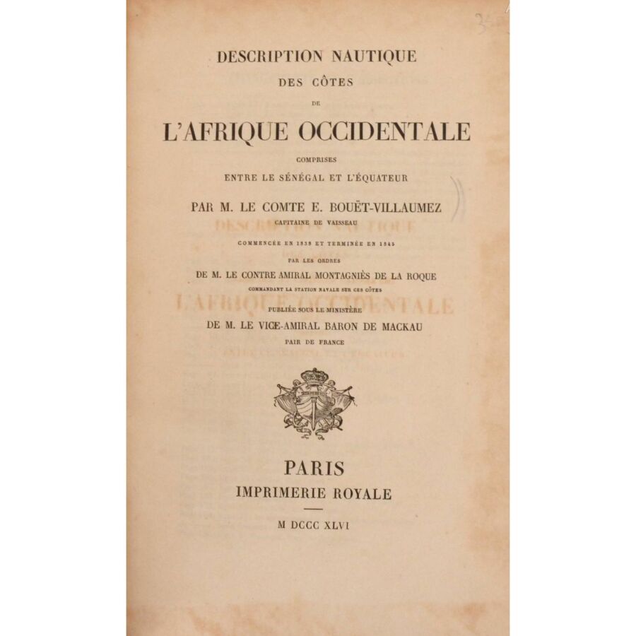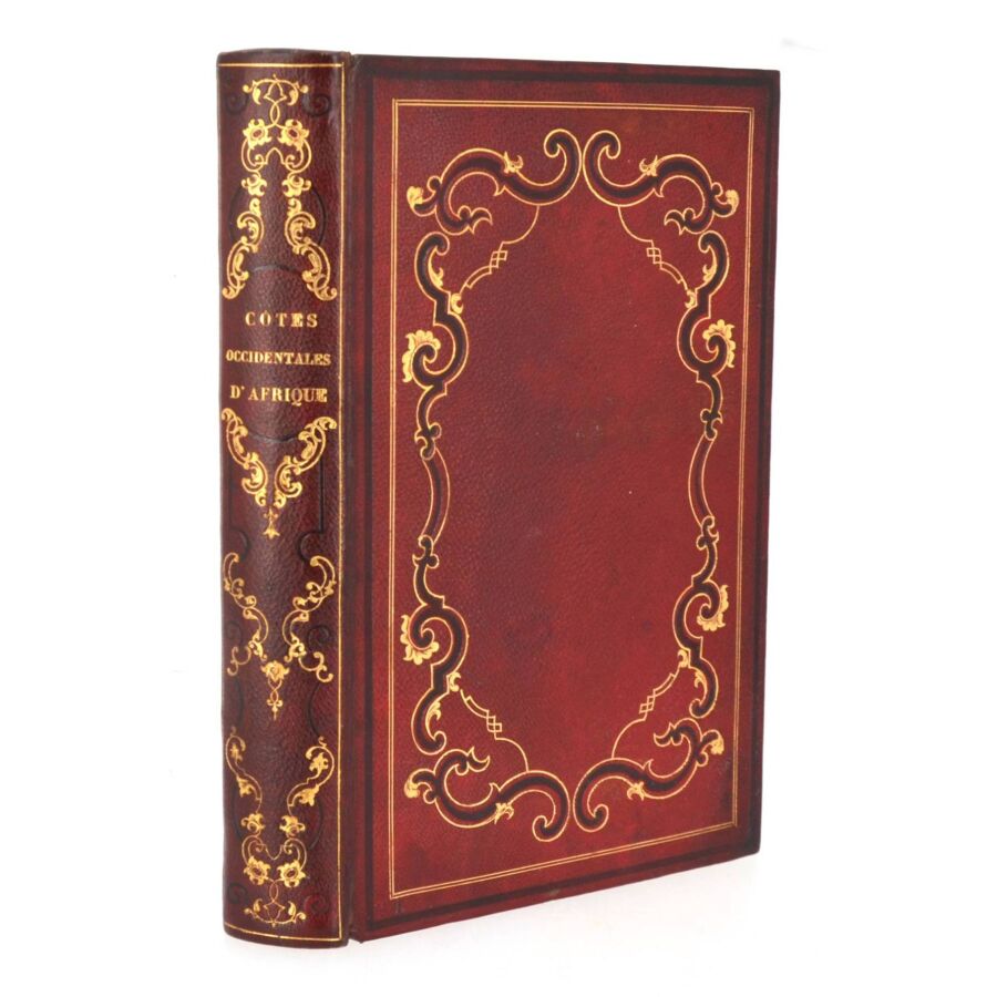BOUËT-VILLAUMEZ (Louis Édouard). Description nautique des côtes de l'Afrique occidentale comprises entre le Sénégal et l'équateur. Paris, Imprimerie Royale, 1846. In-4, chagrin rouge, dos lisses richement orné de motifs dorés et à froid, large décor d'encadrement des plats composé de motifs et de filets dorés et à froid entrelacés, filet doré sur les coupes, large bordure intérieure dorée, tranches dorées (reliure de l'époque).
