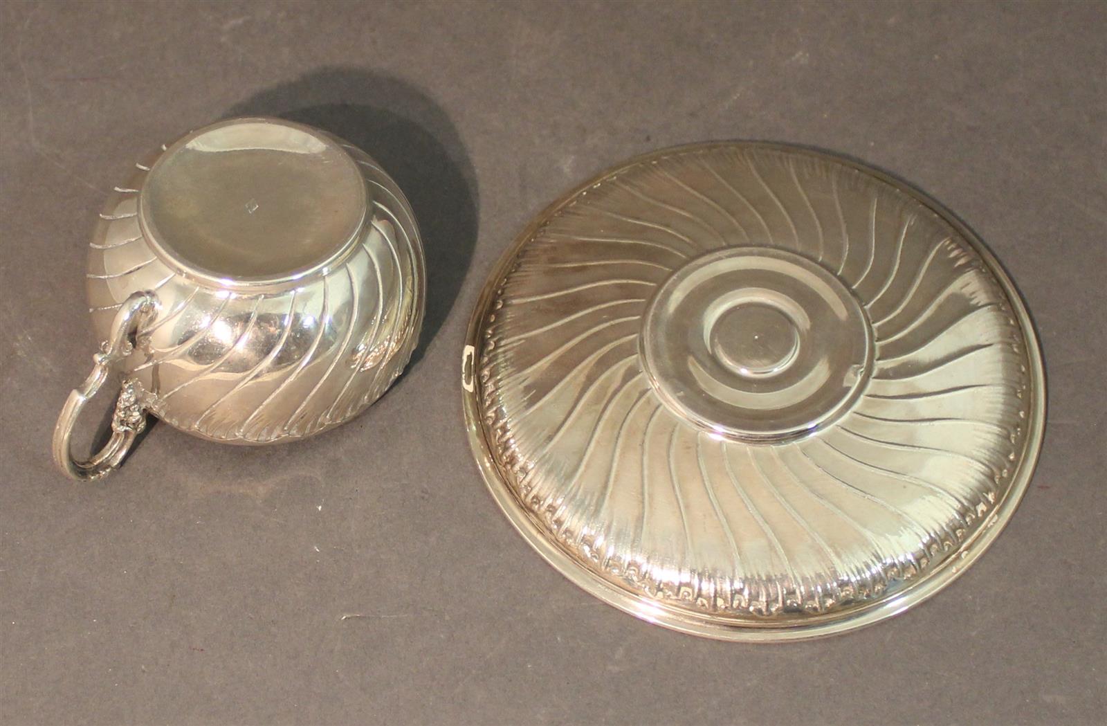 BOULENGER : Tasse et sa soucoupe en argent massif, poinçon Minerve, à décor de côtes torses ourlées de vagues. Poids brut : 160 g environ.