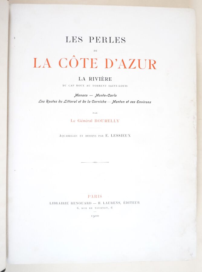 BOURELLY (Général) - Les perles de la côte d'Azur. La rivière au Cap Roux au torrent Saint-Louis. Monaco - Monte-Carlo - Les routes du littoral et de la Corniche - Menton et ses environs - Paris ; Librairie Renouard - H. Laurens, 1900 - 1 volume grand In-4° - Dessins in texte en noir et aquarelles in et hors texte en couleurs par E. Lessieux - Reliure de l'époque demi-chagrin noir (plats rayés avec petits manques de papier, parties de coupes frottées) - Dos à nerfs orné et titré or - Bon exemplaire numéroté sur vélin (n°306 sur les 1650, tirage total : 1700).