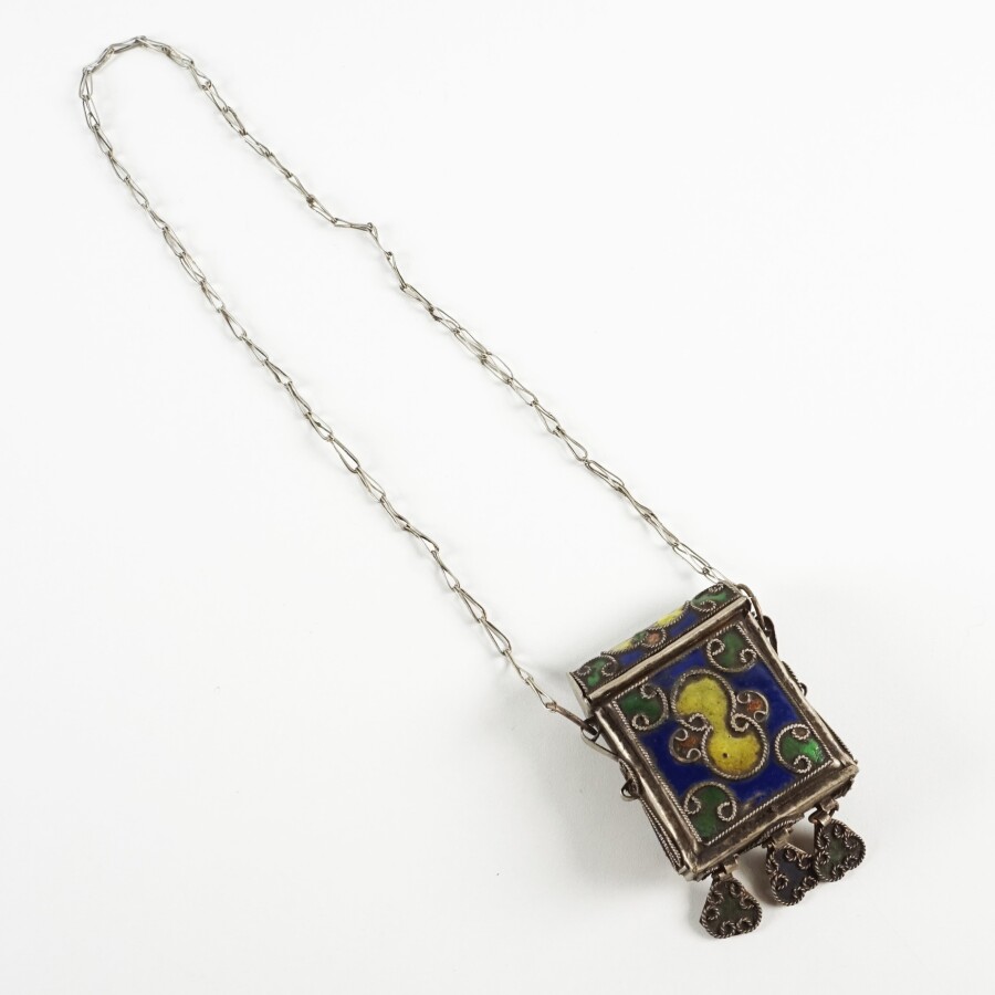 Bourse, argent filigrané et email polychrome à décor géométrique, agrémentée de trois pendeloques, travail du bassin méditerranéen, 7 x 5 cm.