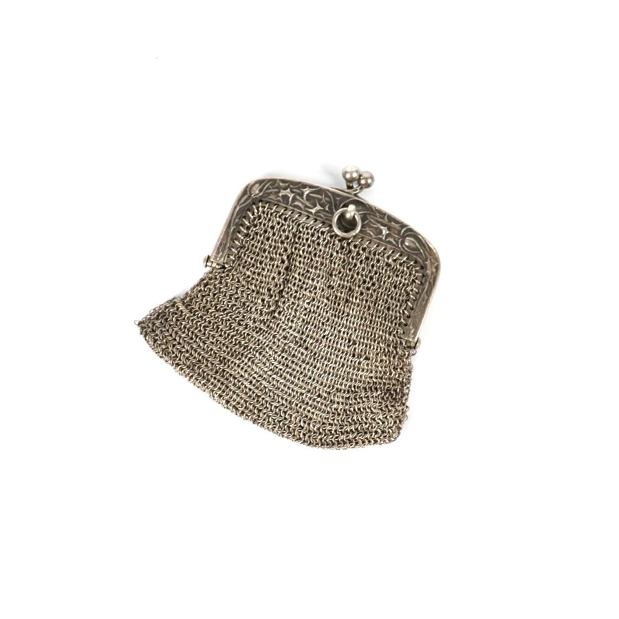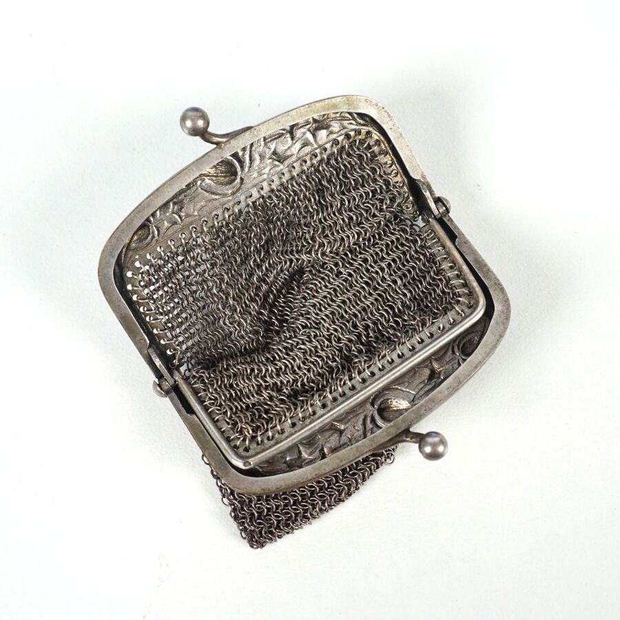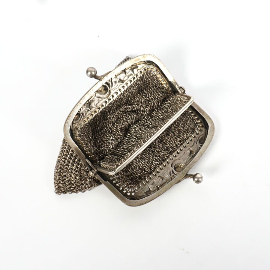 Bourse en argent (800/oo), corps en maille à deux compartiments, Poids brut : 40.8 g environ.