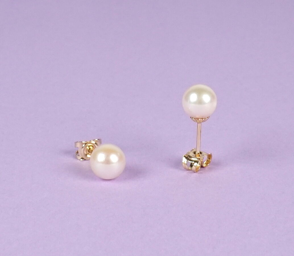 Boutons d'oreilles "Perle" en or jaune 18K (750/oo), ornés chacun d'une perle de culture du Japon 7.5/8 mm, fermoirs poussettes belges. Poids brut : 2.1 g environ.