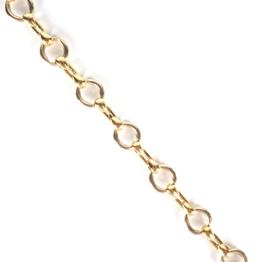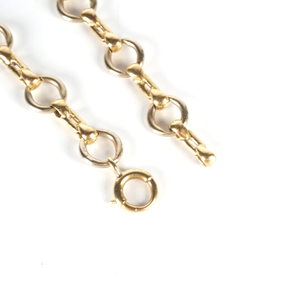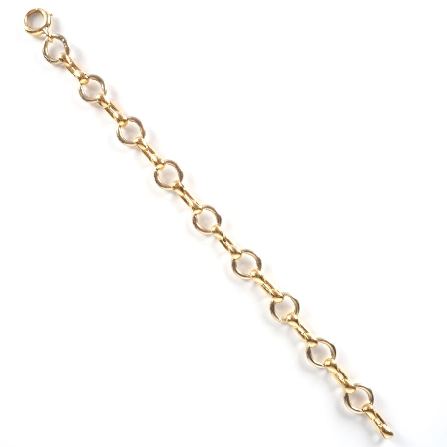 Bracelet articulé en or 2 tons 18K (750/oo), maillons ronds alternés d'agrafes, fermoir à anneau ressort, L. 18.8 cm. Larg.1 cm. Poids brut : 20.4 g environ.