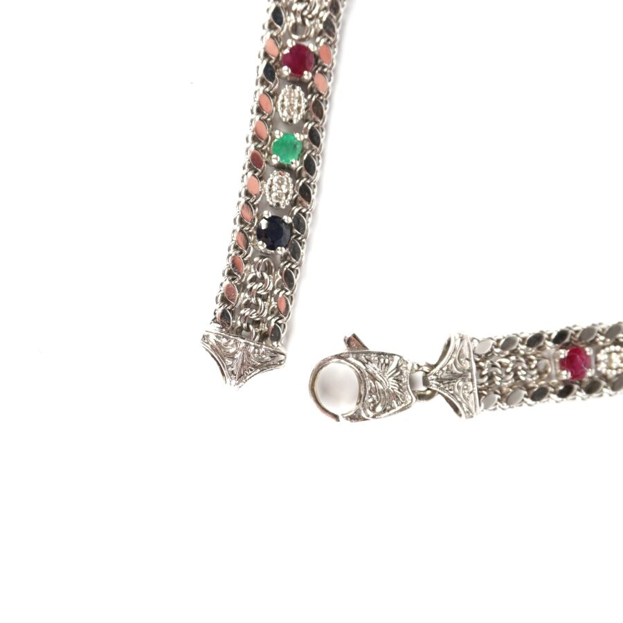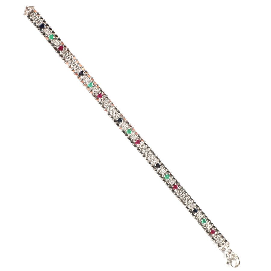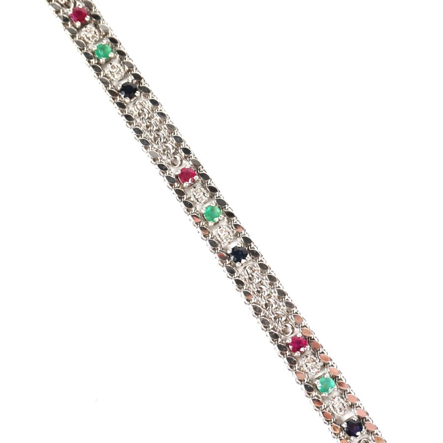 Bracelet articulé en or gris 18K (750/oo), maille plate style gourmette sertie de 5 petites émeraudes rondes (D. 2.7 mm), 5 petits saphirs bleus (D. 2.7 mm) et de 5 petits rubis ronds (D. 2.7 mm) alternés de 20 petits diamants, fermoir mousqueton à décor ciselé de feuillages, Larg. 7 mm. L. 19.9 cm. Poids brut : 13.3 g environ.