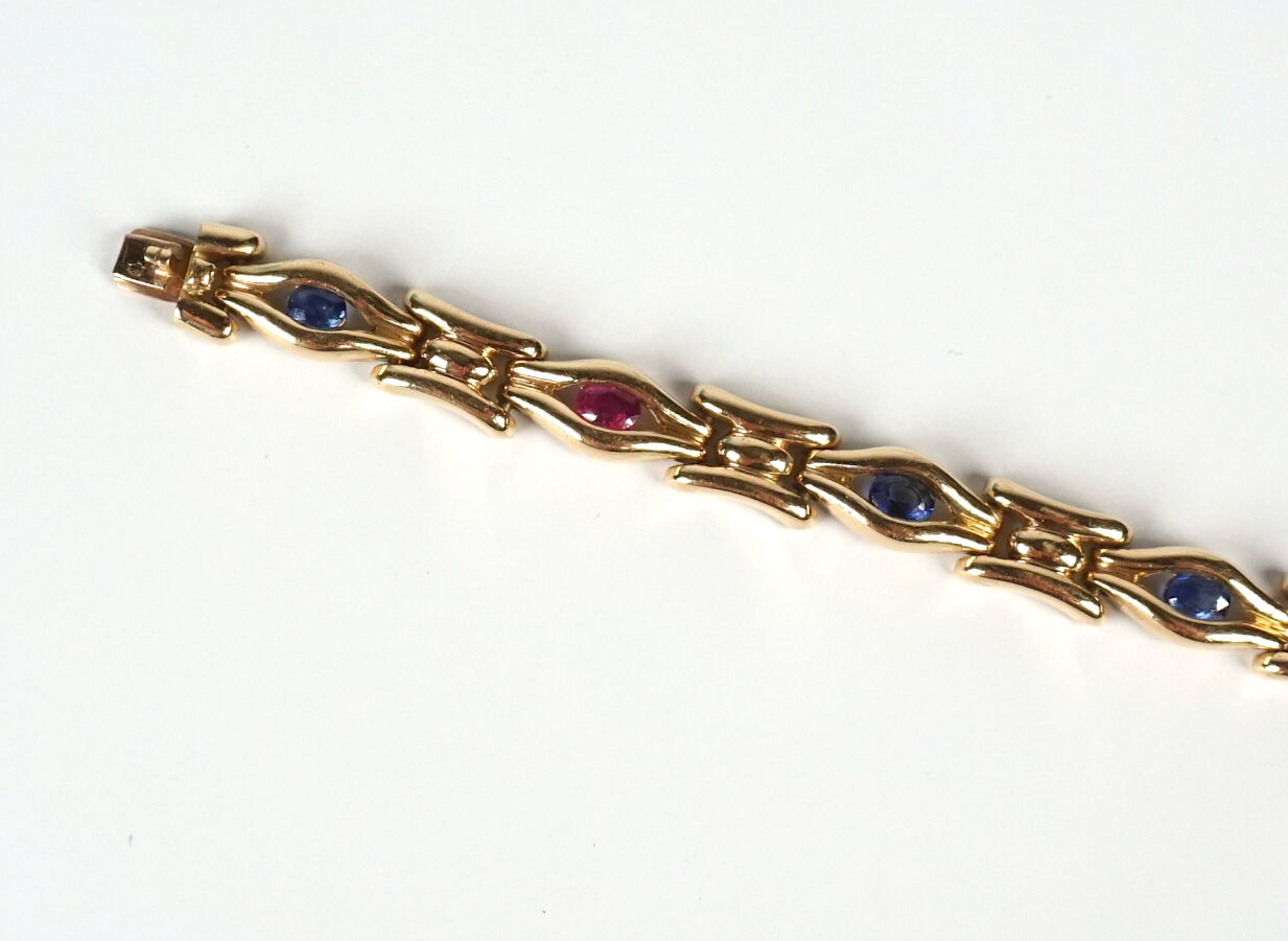 Bracelet articulé en or jaune 18K (750/oo), les maillons alternant motifs convexes et concaves, sertis de saphirs, émeraudes et rubis taille ovale (4 x 3 mm environ), fermoir à cliquet, L. 17.5 cm. Poids brut : 19.9 g environ.