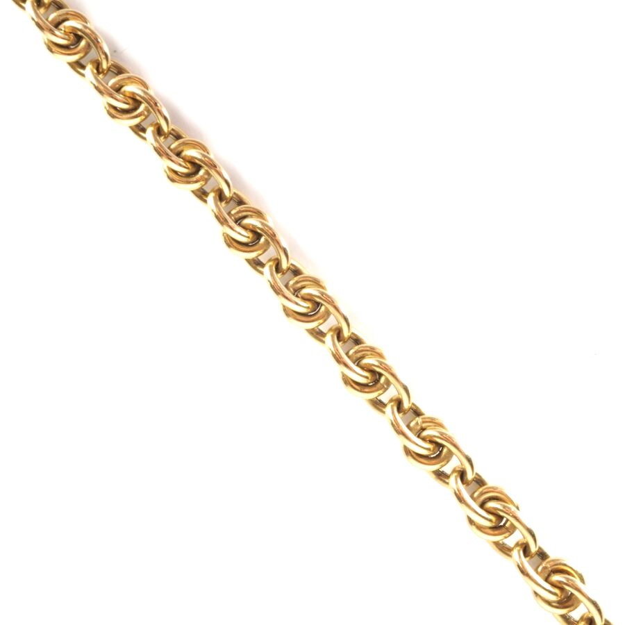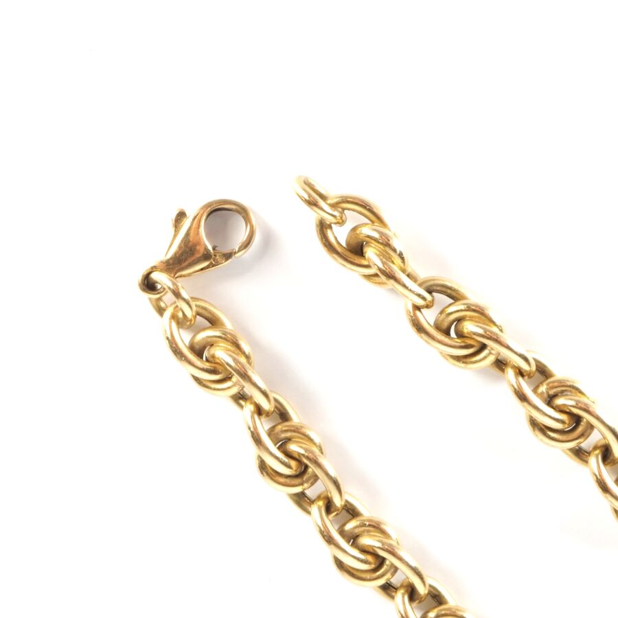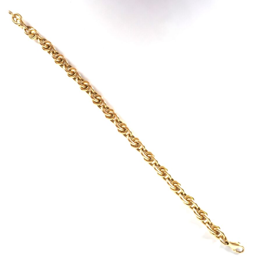 Bracelet articulé en or jaune 18K (750/oo), maille formée d'anneaux entrelacés, fermoir mousqueton, L. 19.3 cm. Larg. 7 mm. Poids brut : 11.9 g environ.