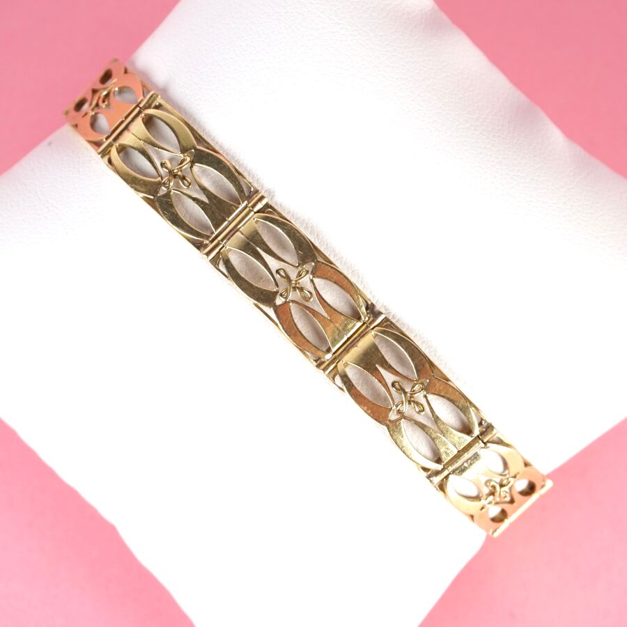 Bracelet articulé en or jaune 18K (750/oo), maille rectangulaire ajourée à décor géométrique, fermoir à cliquet avec chaine de sécurité, L. 18 cm. Poids brut : 13.4 g environ.