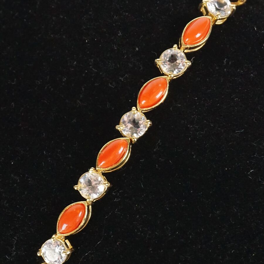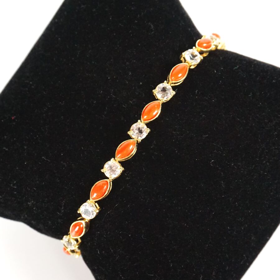 Bracelet articulé en vermeil (925/oo) serti de 15 cabochons de corail taille navette (D. 6 x 3 mm) alternés de 15 topazes blanches (D. 4 mm), fermoir à cliquet, L. Totale 19.1 cm. Larg. 5 mm. H. 5 mm. Poids brut : 10.7 g environ.