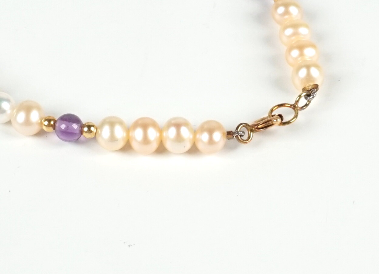 Bracelet de perles 4 mm et de pierres violettes, probablement des améthystes, fermoir en or jaune (750/oo), L. 19 cm. Poids brut : 5.75 g environ.