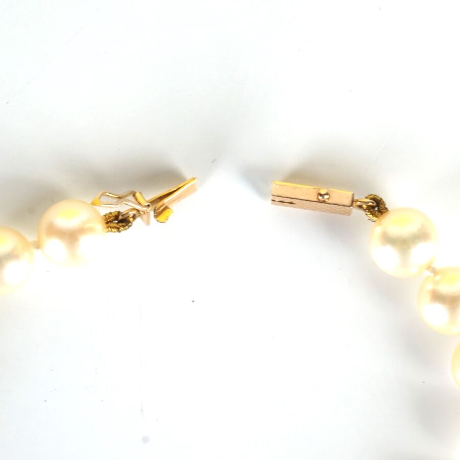 Bracelet de perles blanches (D. 8 mm), fermoir quadrangulaire ciselé à cliquet en or jaune 18K (750/oo) avec 8 de sécurité, L. 19.5 cm environ. Poids brut : 13.6 g environ